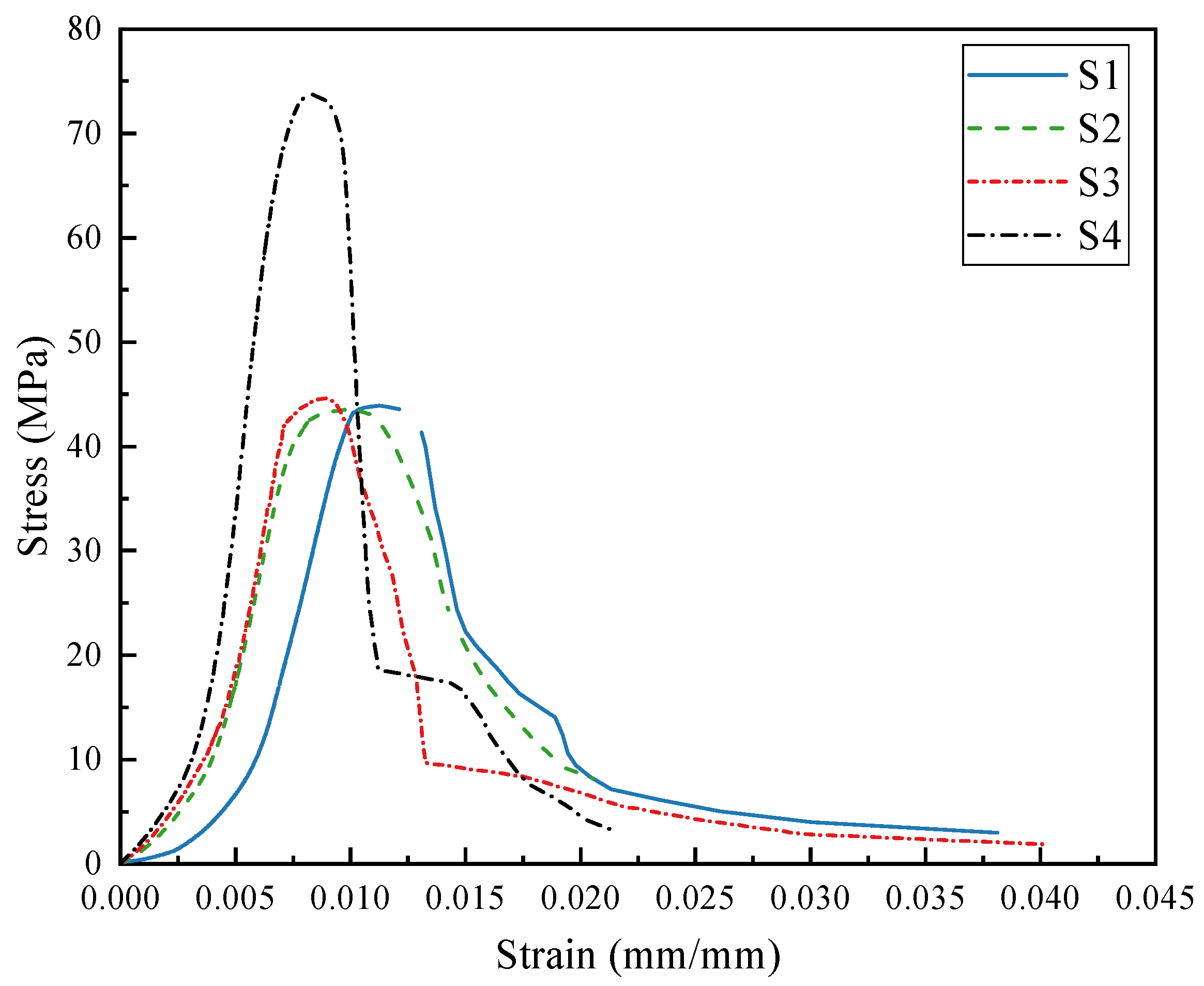 Figure 13. The figure illustrates the stress–strain characteristics of concrete samples S1 to S4. All curves exhibit a development pattern similar to that of ordinary concrete and can be divided into four stages: the elastic stage, the elastoplastic stage, the yield stage, and the failure stage.