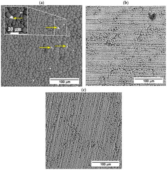 SEM (BSE) images of samples with Zn-Ca-P layer with exposure times of (a) 25 (arrows pointing to the layer defects), (b) 30, and (c) 35 s.