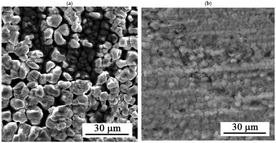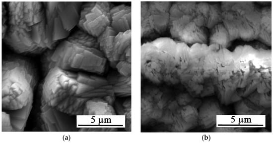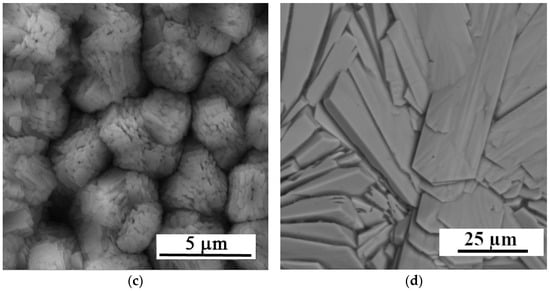 Figure 2b,c present the sample surfaces after immersion for 30 and 35 s, respectively. In both cases, a more homogeneous and compact Ca-P layer without significant surface defects is formed compared to the shorter exposure time. For the sample exposed for 35 s (Figure 2c), the prepared layer is more compact and uniform than the layer on the sample exposed for 30 s (Figure 2b). Detailed images of the deposited layers are in Figure 3.