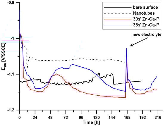 For both samples with a Zn-Ca-P layer, after the initial stabilisation in the first 48 h, there is a shift towards more positive potential values. For the layer with a deposition time of 35 s, this increase is more significant compared to the deposition time of 30 s and remains at more positive values until the electrolyte is replaced after 168 h of exposure. After the electrolyte was replaced, there was an increase in potential values and subsequent stabilisation at a level close to the values before the electrolyte was replaced.