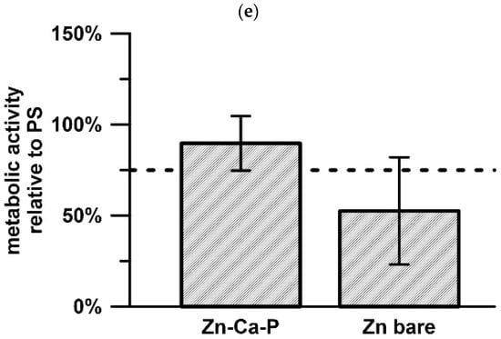 Cell adhesion on the investigated surfaces was evaluated qualitatively using microscopy after incubation directly on the surface. Cells were clearly observed on the Zn-Ca-P coated samples, where they adhered to the surface and exhibited a spread morphology. In contrast, the uncoated alloy substrate showed a lower level of cell coverage of the surface, with the surface remaining partially free of cellular coverage (Figure 8a,b). On the Zn-Ca-P layer, cells were distributed across the surface and formed visible attachment points, indicating successful initial adhesion (Figure 8c,d). Furthermore, a second experiment was conducted, representing an equivalent of the extract test but performed under more physiologically relevant conditions, to assess the metabolic activity of osteoblasts cultured directly in the vicinity of the material (Figure 8e). Compared to the untreated surface, the objective was achieved, as evidenced by a reduced data scatter and an increased median value of viability.