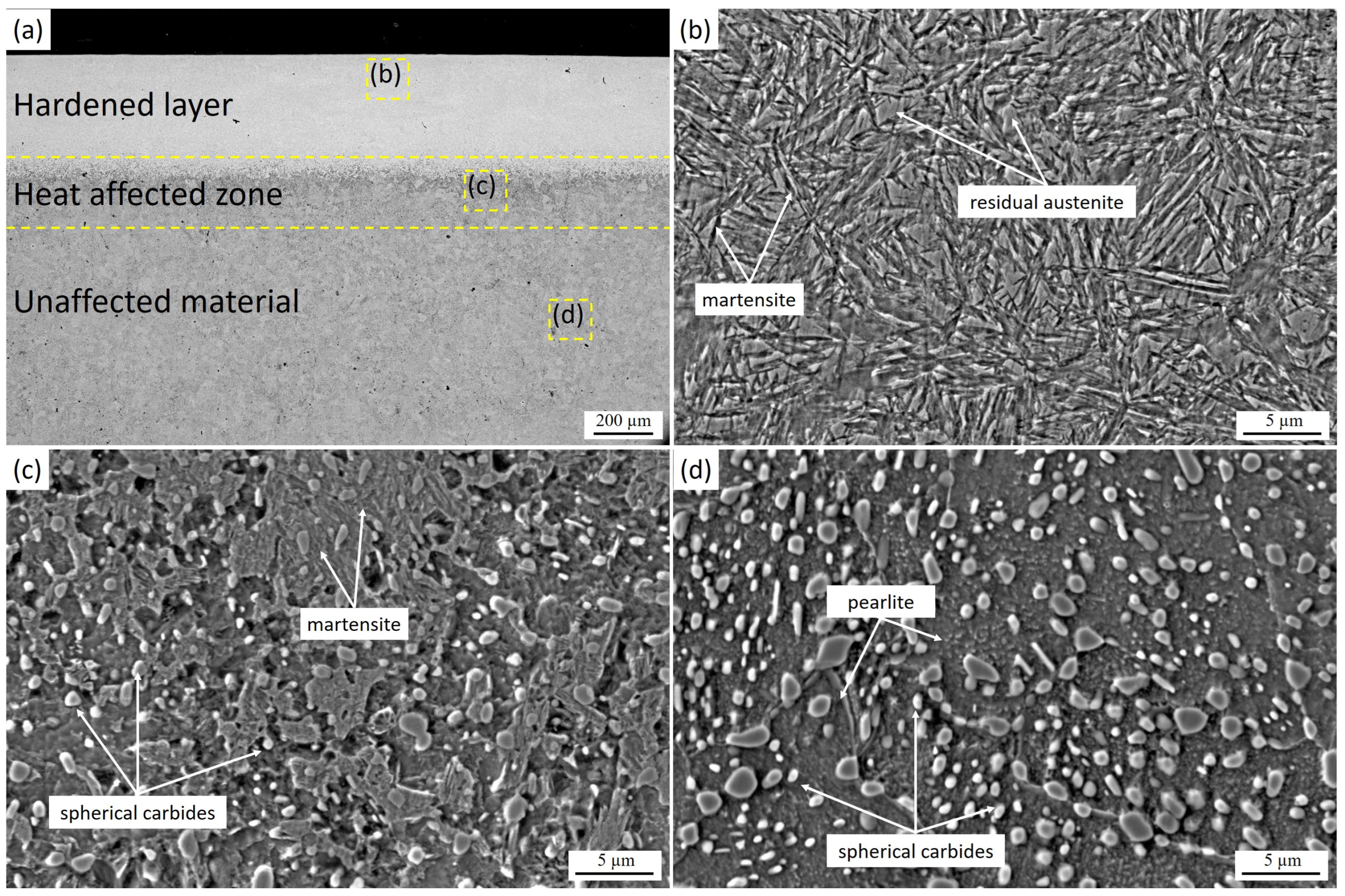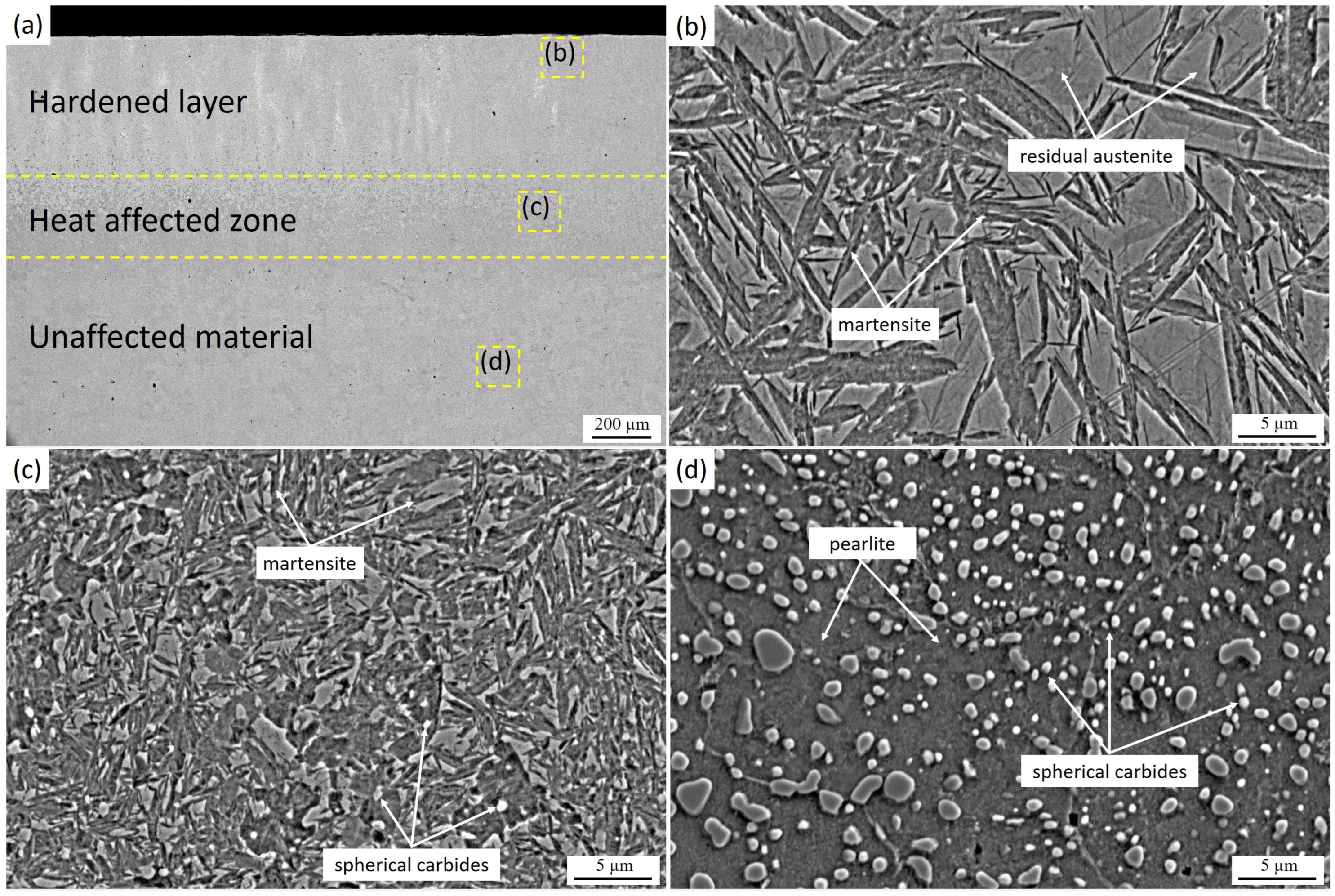 Figure 3c). In this region, spherical pearlite colonies and carbides partially dissolve and transform into austenite; however, due to the comparatively lower heating temperature, part of the pearlite remains, and the degree of carbide dissolution is lower than in the surface layer. This results in an increased amount of retained austenite and a reduced carbide fraction in the transition zone, consistent with the thermal gradient across the depth of the hardened layer. In the untreated region (