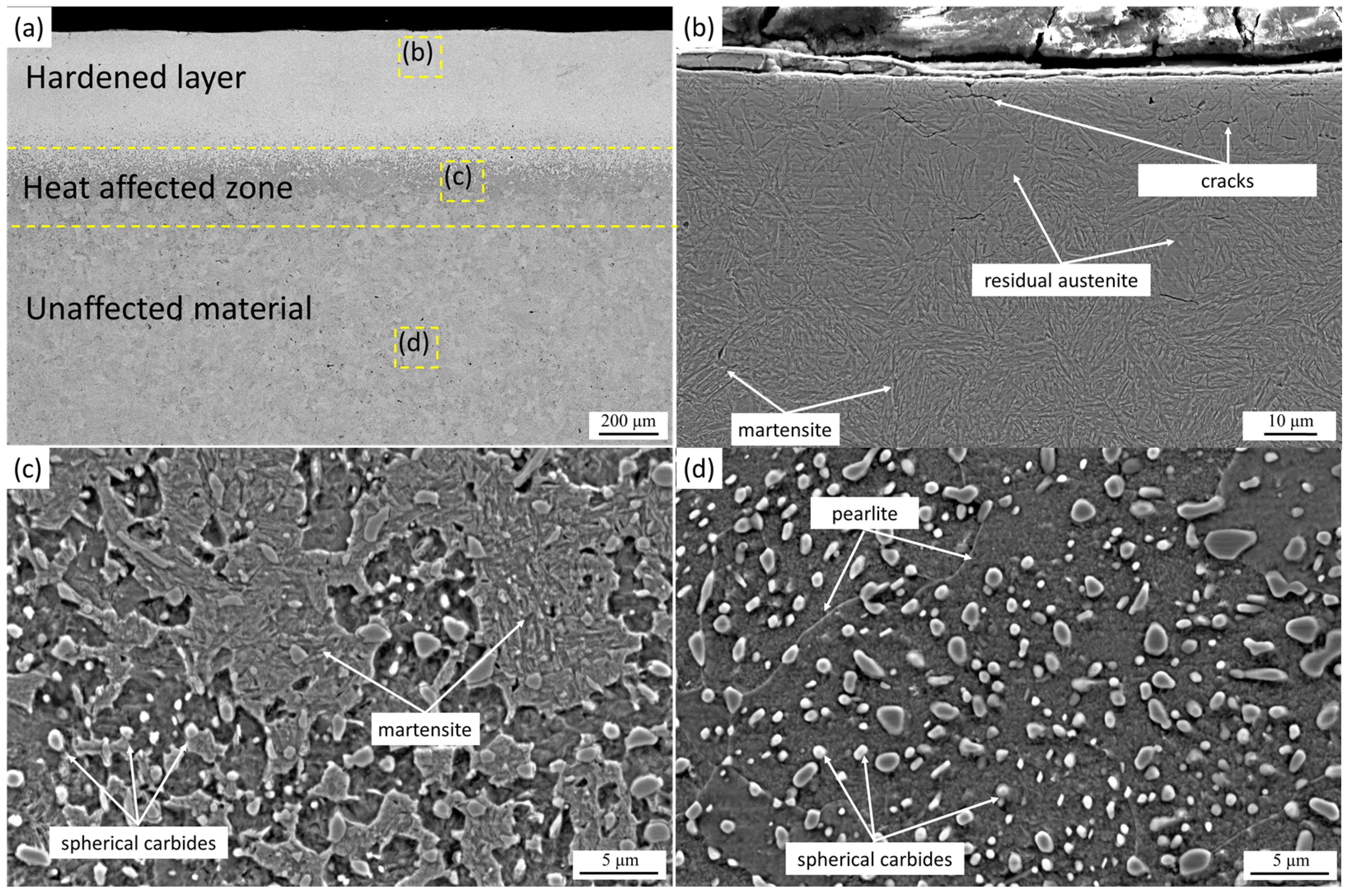 Figure 2d), the steel retains its initial pearlitic microstructure with uniformly distributed spherical carbides, indicating that cracking is confined to the laser-affected zone.
