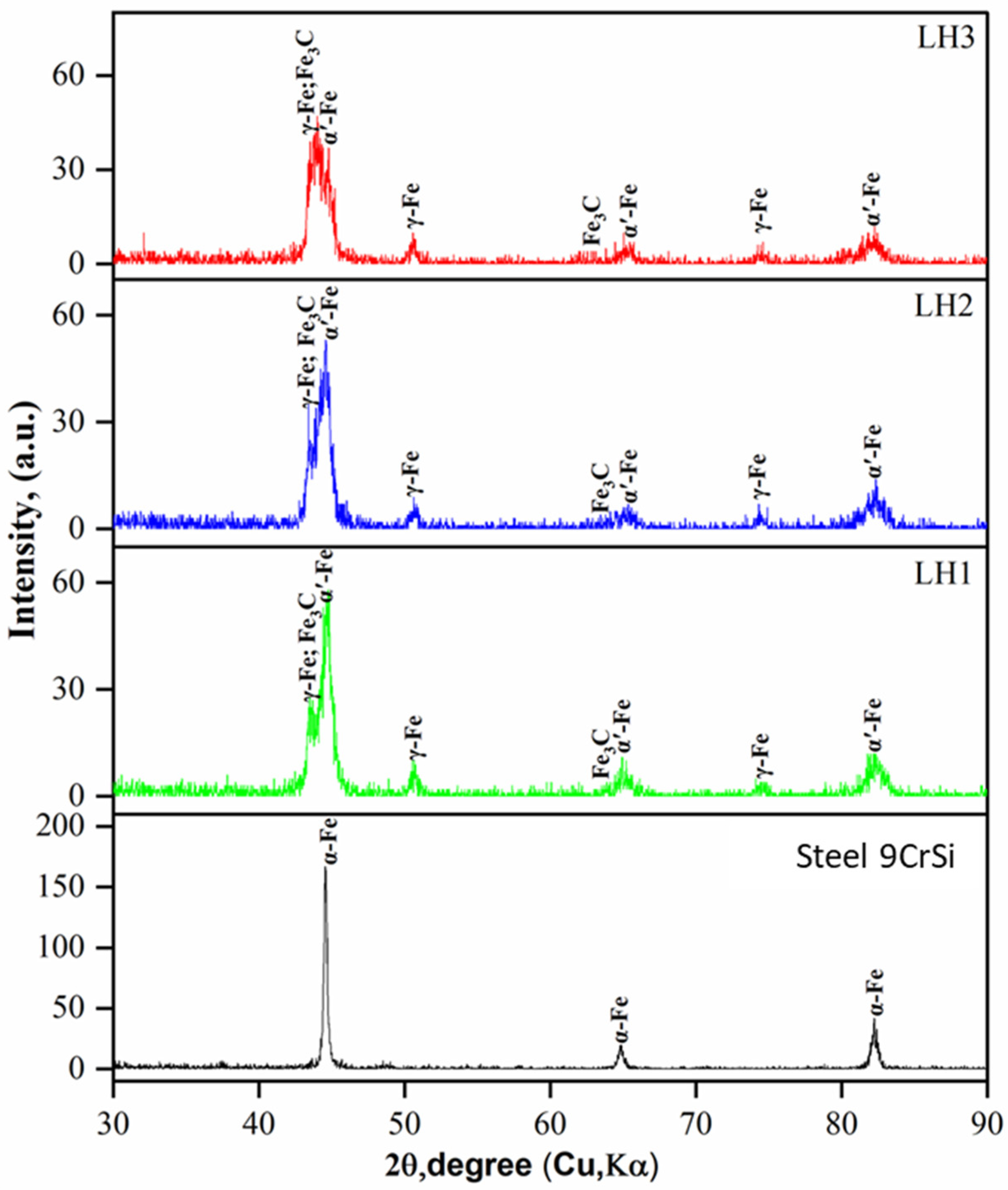 3C-type carbides—which is consistent with the metallographic observations. Notably, sample LH3 exhibits a predominance of α′-Fe peak intensities accompanied by a pronounced reduction in the γ-Fe contribution. This indicates the lowest fraction of retained austenite among the investigated regimes and confirms more extensive structural transformation resulting from the increased laser power and scanning speed.