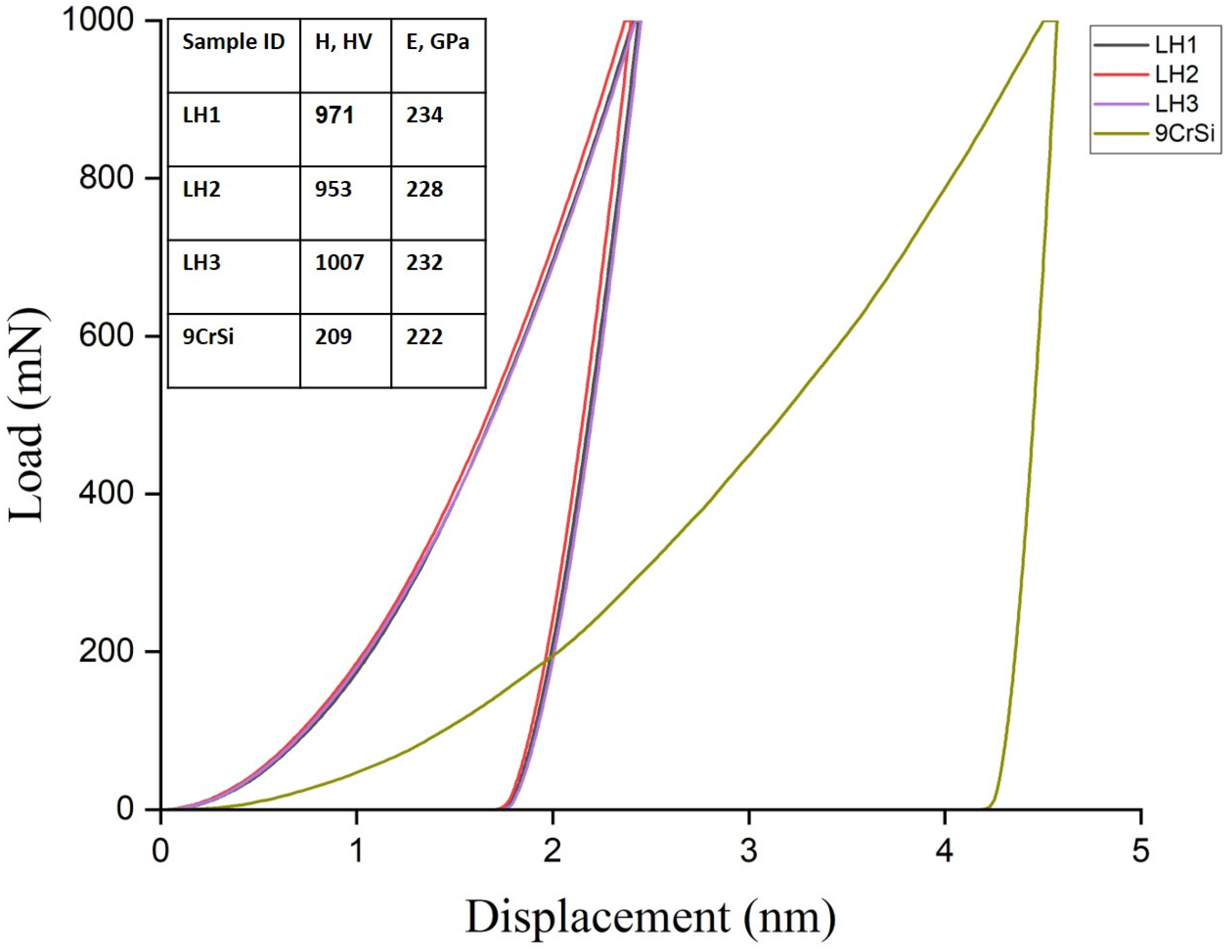 Figure 5 presents the load–unload curves obtained by instrumented indentation for 9CrSi steel in the initial condition and after laser hardening under regimes LH1, LH2, and LH3, together with the corresponding hardness and elastic modulus values. All laser-hardened samples exhibit a reduced maximum indentation depth compared with the untreated steel, indicating an increased resistance to deformation associated with the formation of a martensitic surface layer. The highest hardness was obtained for sample LH3 (1007 HV