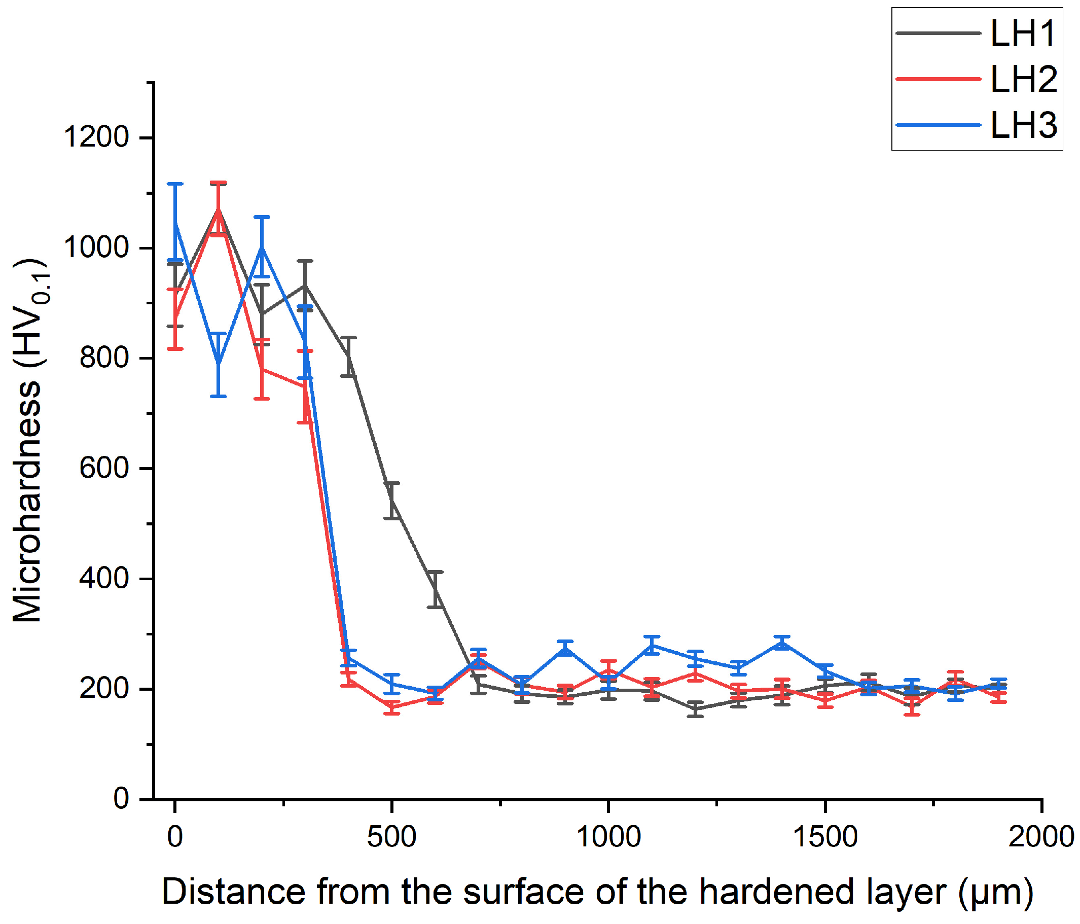 0.1), which is attributed to the reduced fraction of martensite and the corresponding increase in the pearlitic matrix. The smoothest hardness transition is observed for sample LH1, which is associated with the lower scanning speed and consequently higher thermal input, resulting in a wider transition zone—consistent with the microstructural features shown in