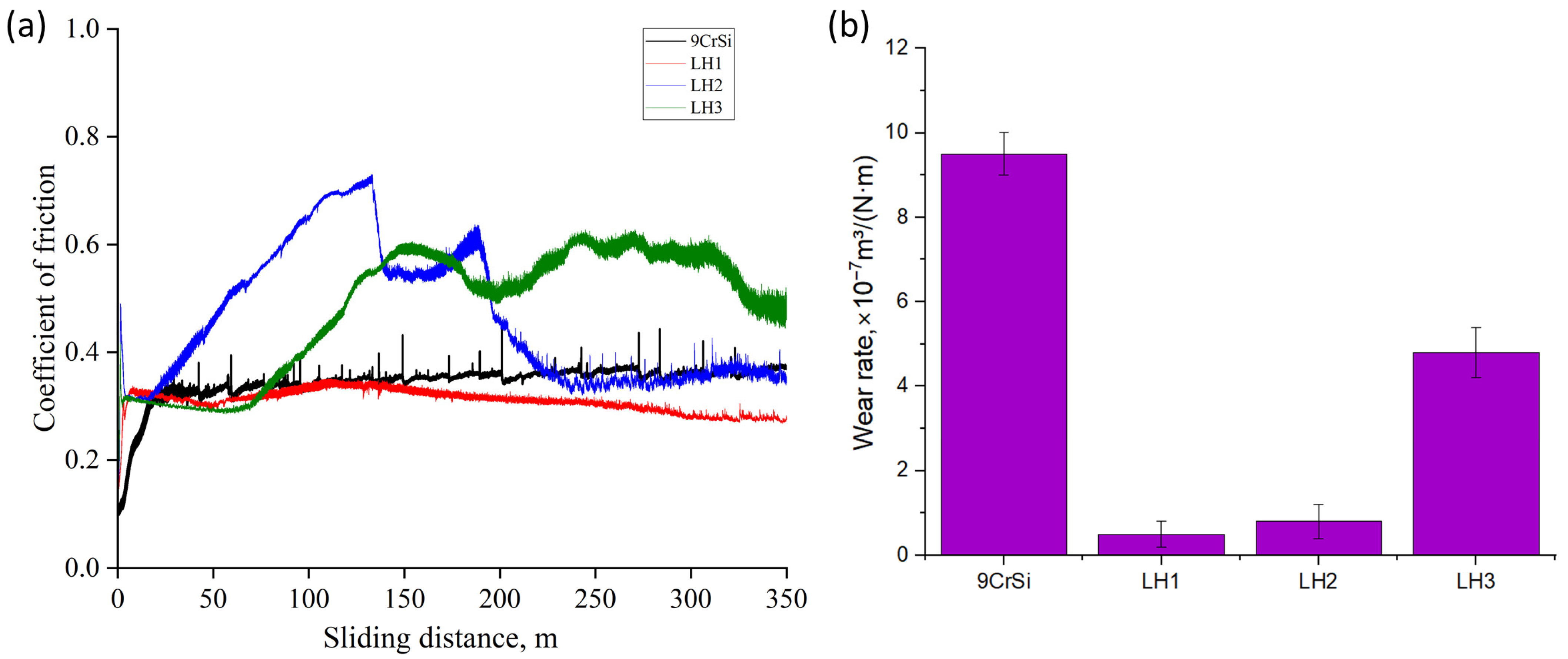 2 counterbody. It is evident that laser treatment significantly alters the tribological behavior of the material. The untreated 9CrSi steel exhibits a relatively high and unstable coefficient of friction, which is attributed to its pearlitic structure and lower resistance to plastic deformation under contact loading. In contrast, the laser-hardened samples show a marked reduction in the coefficient of friction and improved stability throughout the test. The lowest friction values were observed for sample LH2, which is associated with an optimal balance between martensite and retained austenite, promoting more uniform wear and reduced contact stresses. Sample LH1 demonstrates moderate friction values, whereas LH3 exhibits a higher coefficient of friction compared with LH1 and LH2, likely due to increased brittleness of the martensitic structure formed under the high thermal input. The wear-rate diagram (