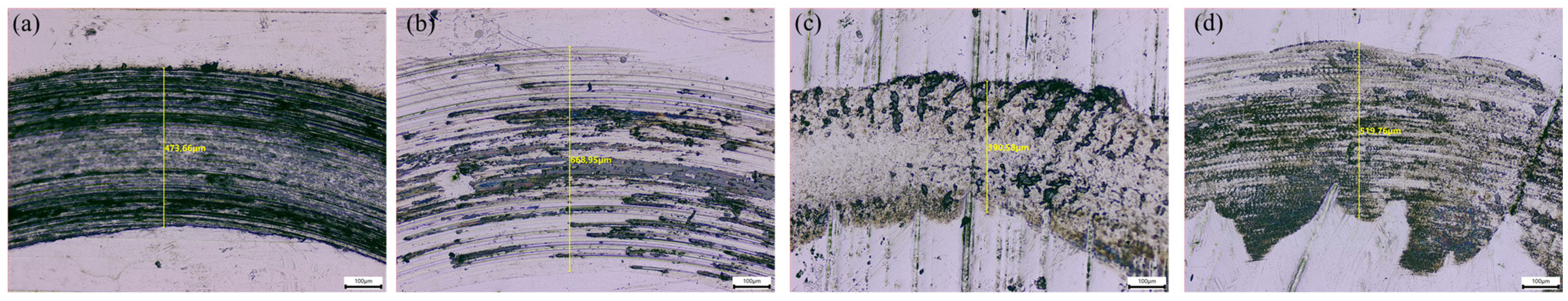 Figure 8 shows optical micrographs of the wear tracks formed on the surface of untreated 9CrSi steel and laser-hardened samples LH1, LH2, and LH3 after dry sliding tests against a ZrO