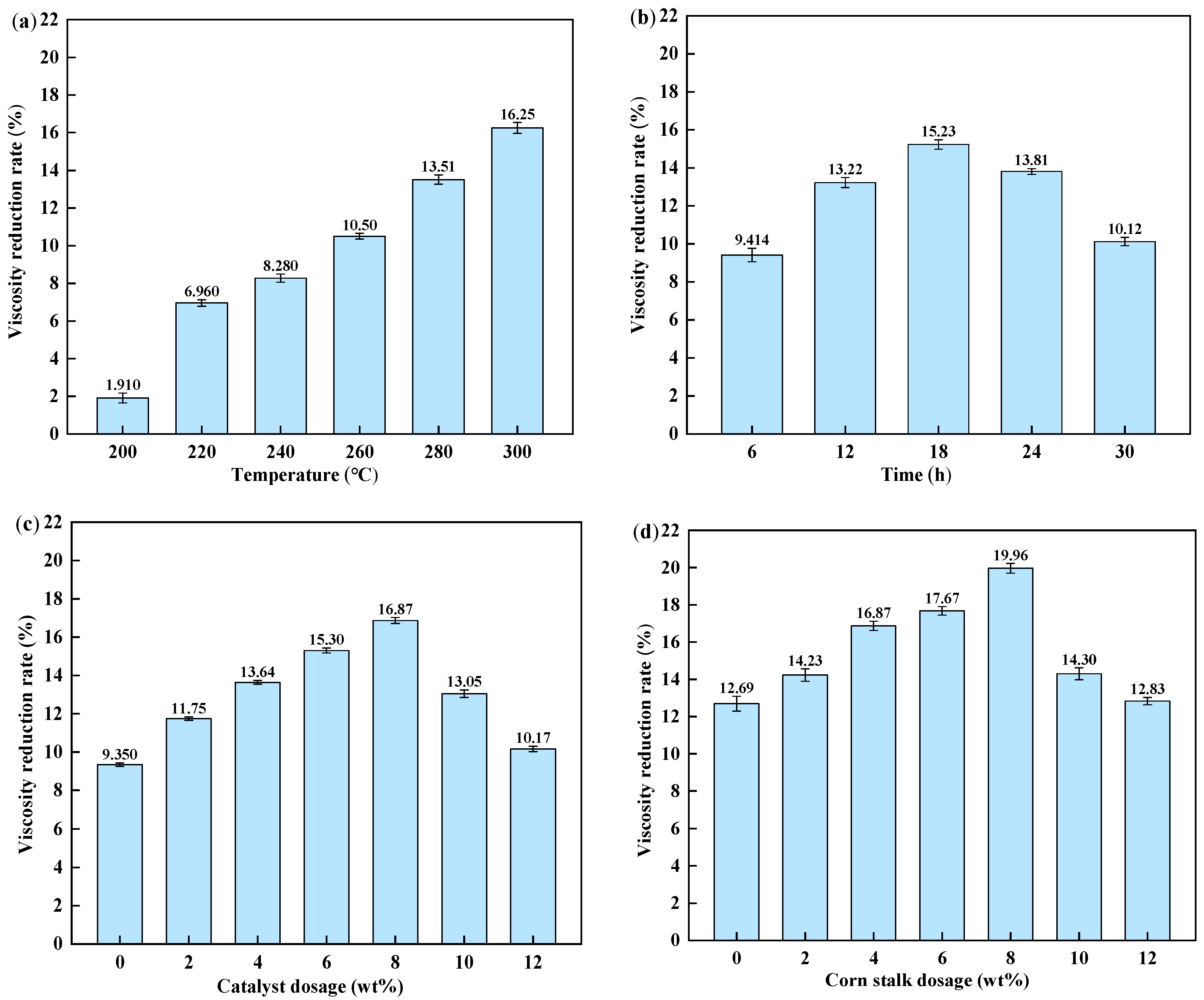 Figure 1a, the viscosity reduction rate increased with temperature. This trend is attributed to enhanced bond cleavage and improved mass transfer under hydrother-mal conditions, together with an increased formation of reactive hydrogen species from water and biomass-derived intermediates [