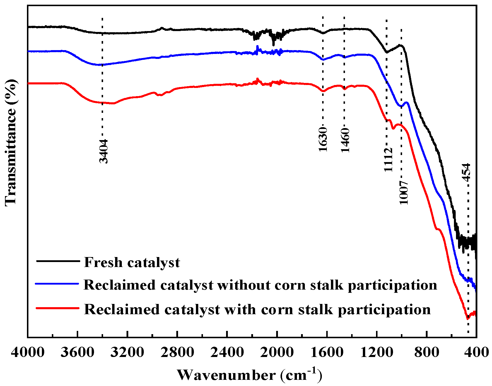 Figure 7b), the reclaimed catalyst exhibits particle agglomeration and structural densification. The original loose, porous structure was partially replaced by larger, block-like aggregates and the pore contours become indistinct. In contrast, the catalyst recovered with corn stalk participation (