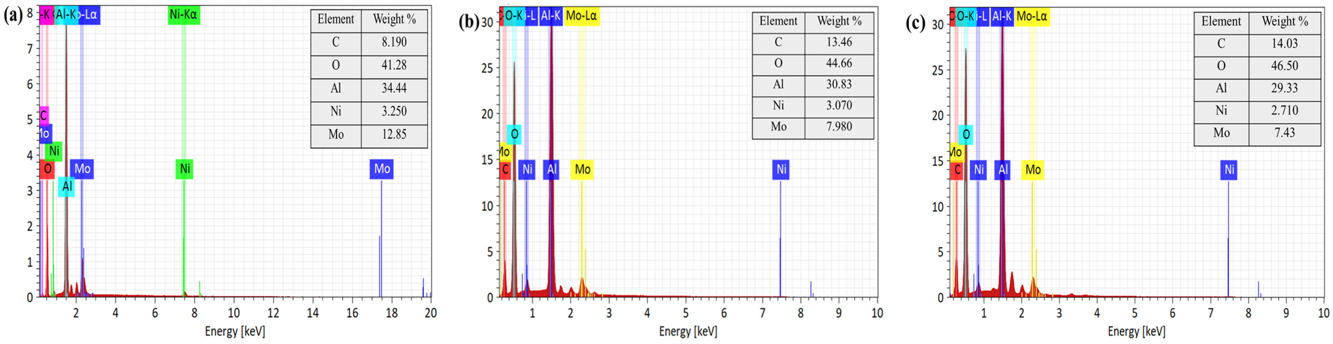 Figure 8. All samples exhibited characteristic signals of aluminum and oxygen from the alumina support as well as nickel and molybdenum from the active components. Compared with the fresh catalyst, the reclaimed catalysts showed increased surface carbon accompanied by higher oxygen signals and decreased apparent nickel and molybdenum contents. Together with the SEM observations, these changes indicate the formation of a deposit layer and intensified agglomeration after the reaction, which progressively covered the catalyst surface and partially masked nickel and molybdenum signals. This effect was more pronounced when corn stalk was present.