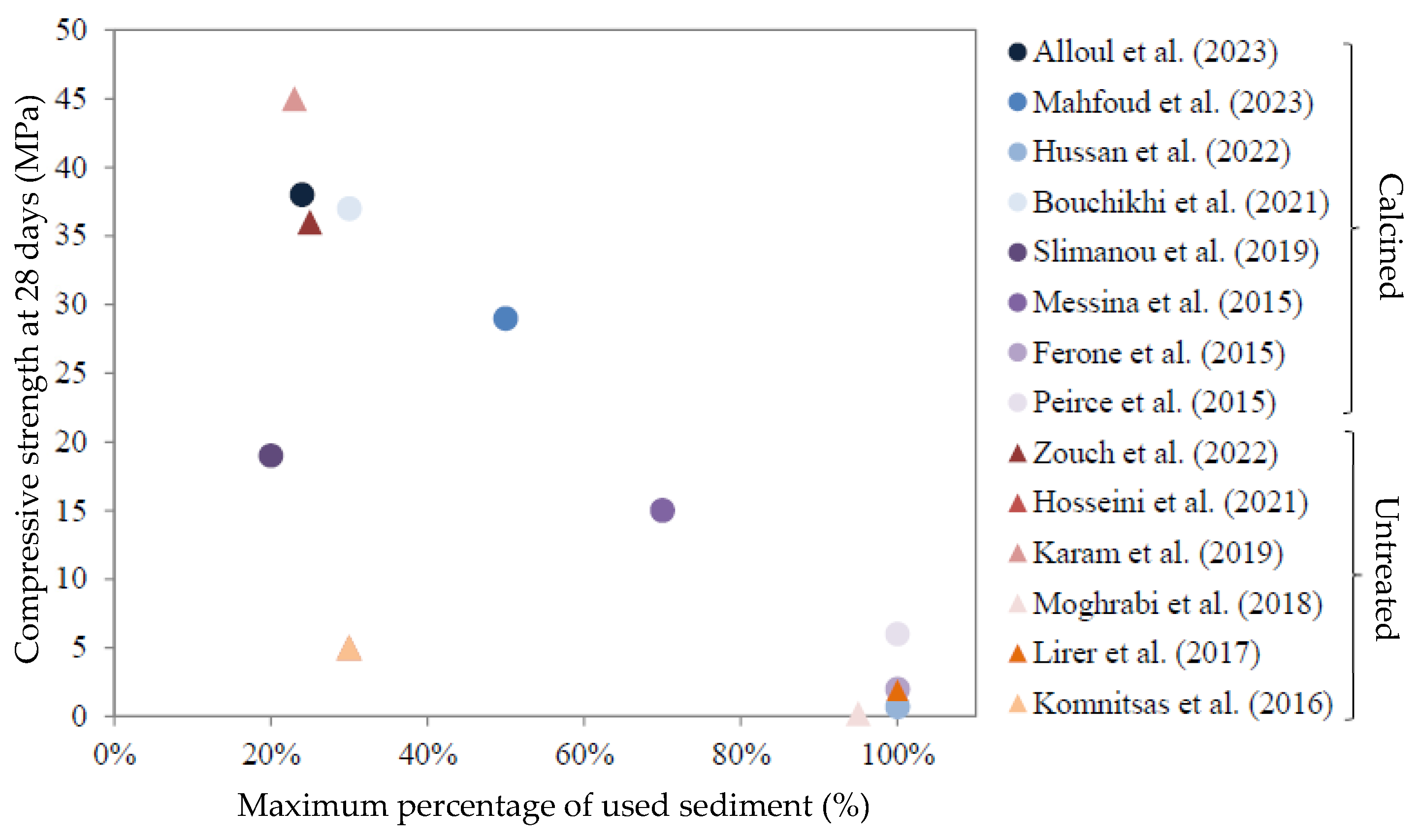 Figure 5 presents the compressive strength values extracted from studies on the geopolymerization of sediments. The studies were selected if the percentage by mass of sediment in the matrices was greater than 70%.