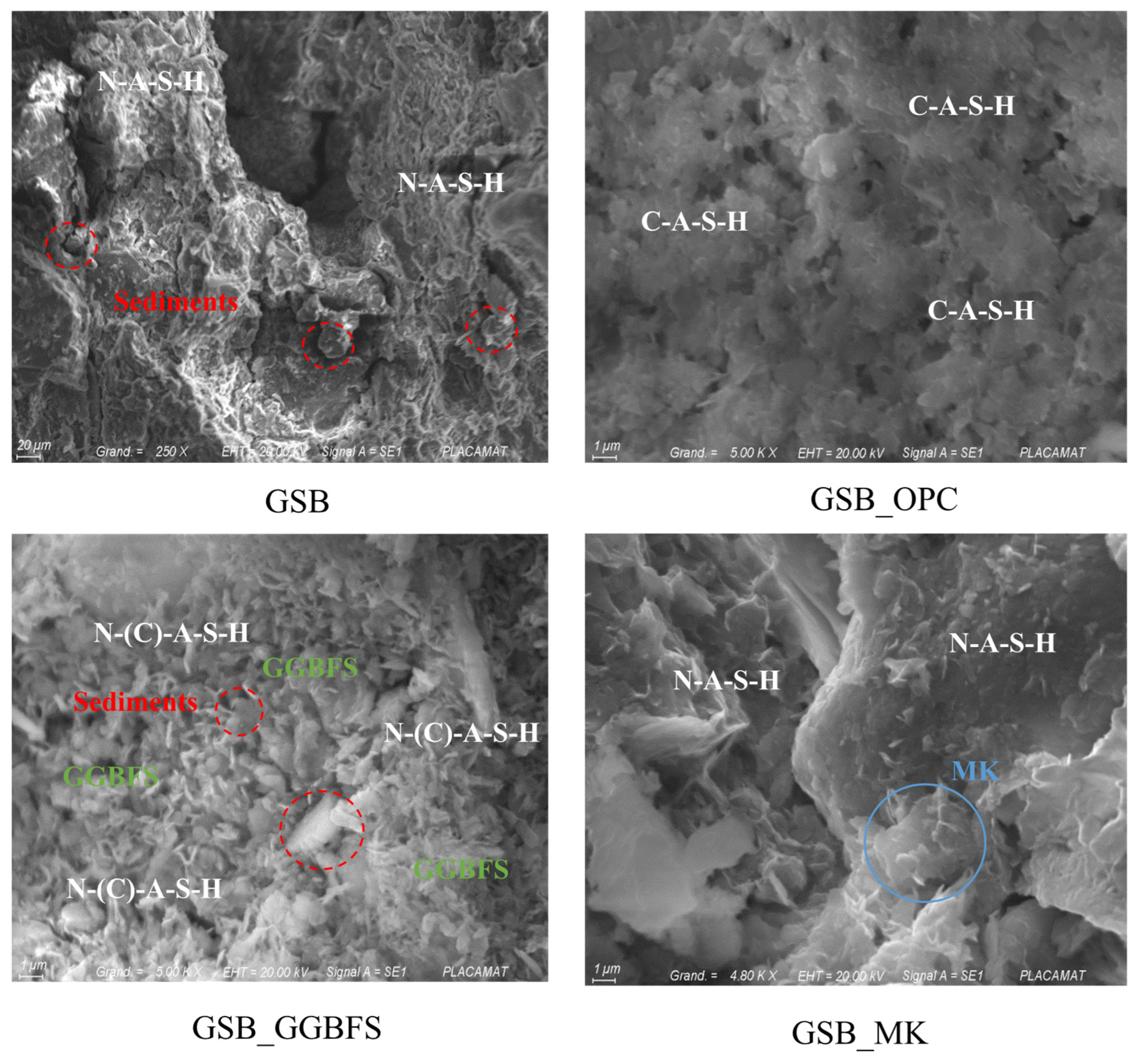 79]. The gel forms around the sediment grains, trapping them in the C-S-H matrix. The formation of C-S-H limits the reaction of sediments during the introduction of alkaline reagents. For GSB_GGBFS, the topology differs from the preceding formulations, and one observes a mixed topology which resembles that of GSB_OPC and that of GSB_MK. In general, it is observed that the precursors retain their initial shape during the geopolymerization process, thus showing that the geopolymeric reaction takes place mainly at the level of the surface layer of the solid particles.
