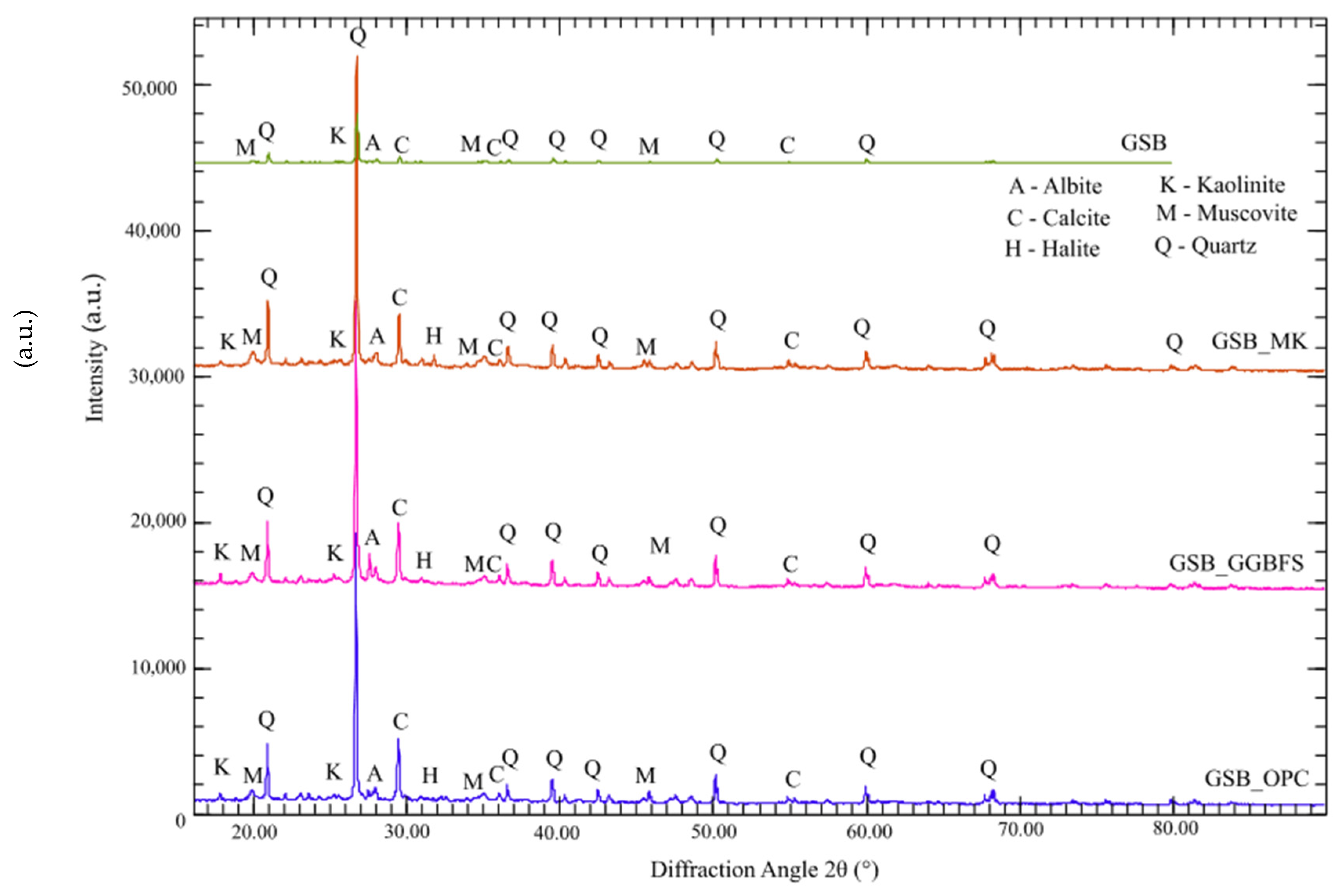 The absence of kaolinite peaks in the GSB system suggests partial alkali attack of clay minerals and their involvement in geopolymerization [