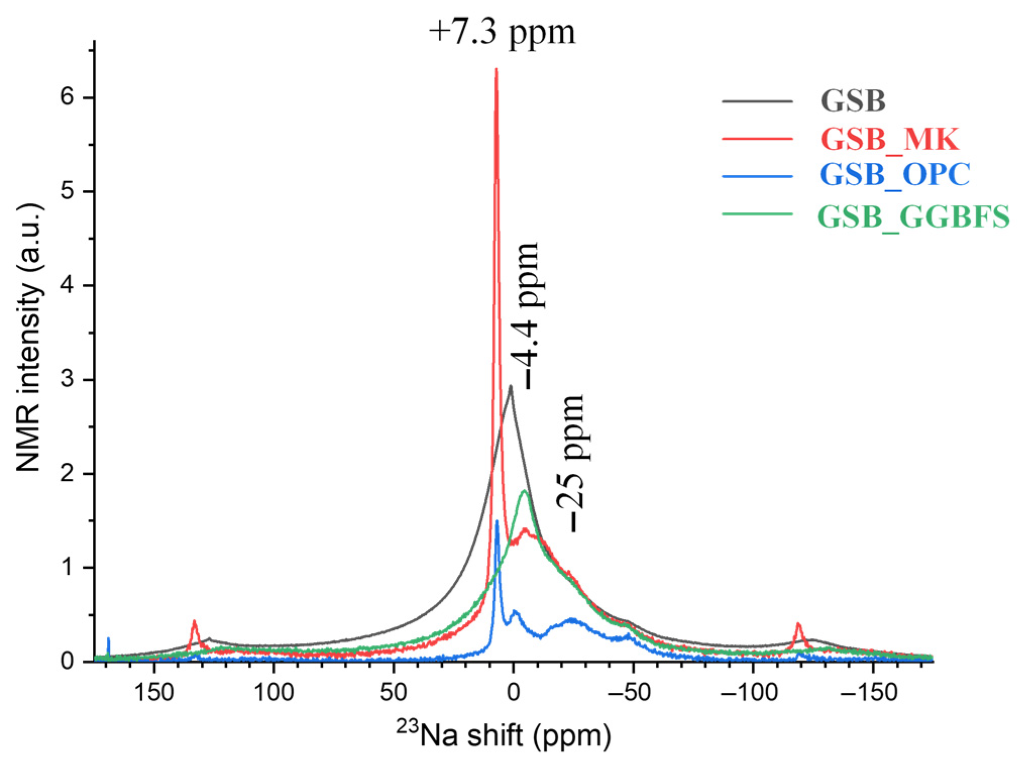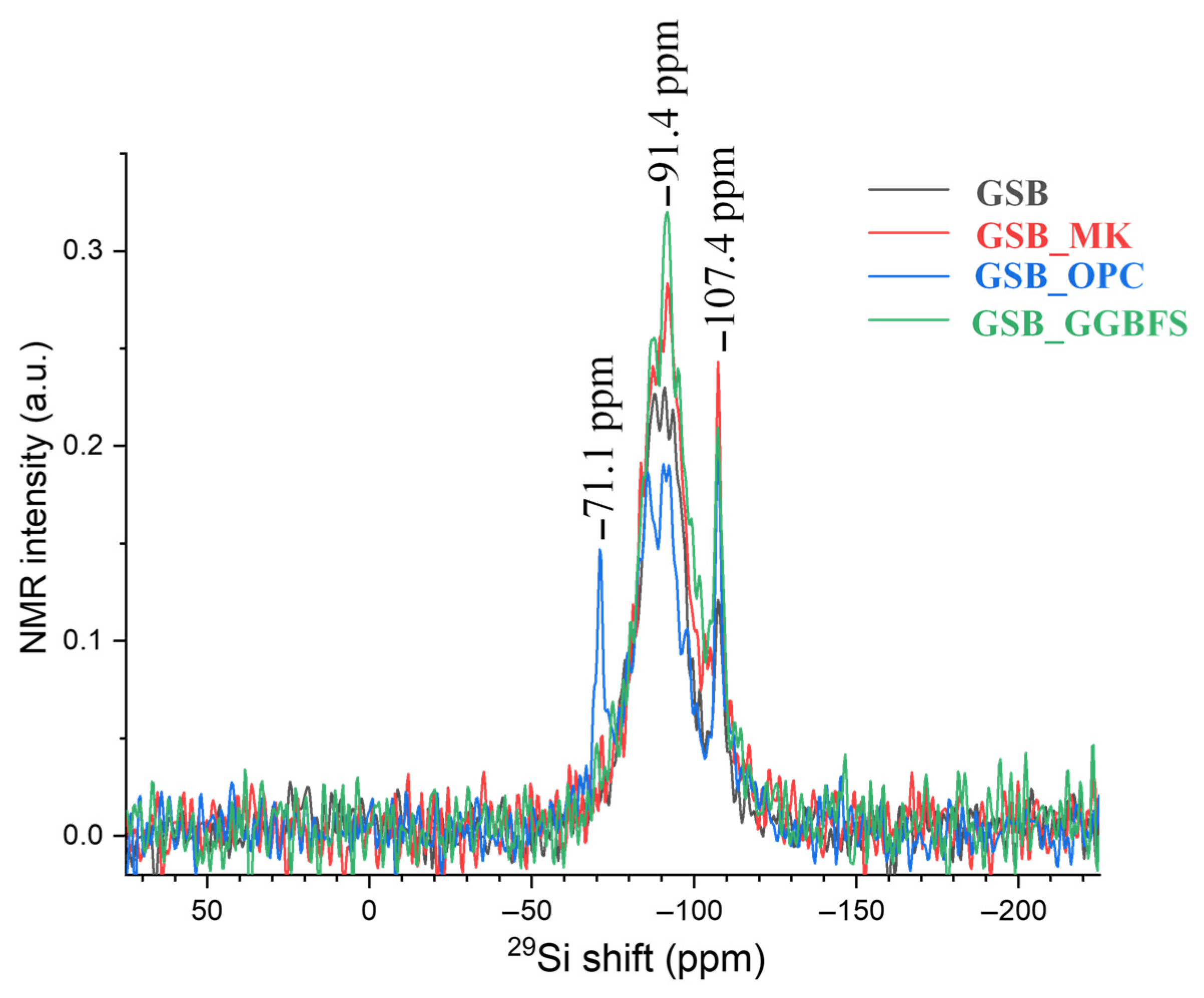 89]. These mechanisms provide a qualitative framework for interpreting the observed spectral trends, but do not allow definitive phase discrimination in the absence of spectral deconvolution. The spectra for the GSB and GSB_MK show the formation of N-A-S-H, while GSB_GGBFS shows similar displacements. This displacement may be associated with the presence of N-(C)-A-S-H. Only observable for GSB_OPC, the peak at −71.1 ppm corresponds to the formation of a C-S-H gel, showing that the following two gels coexist in the matrix: C-S-H and N-A-S-H. Buchwald et al. [