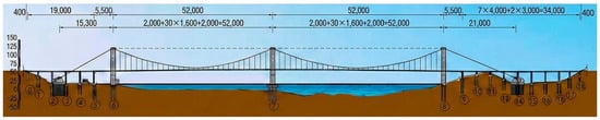 The main bridge is configured as a two-span suspension bridge with a steel box girder deck and a span arrangement of 2 × 520 m. The main cables are arranged in a spatial cable system, and the overall span layout is 153 + 2 × 520 + 200 m, with a rise-to-span ratio of 1/9.16. Each main span is equipped with 31 pairs of hangers, with a longitudinal spacing of 16 m between adjacent hangers. The structural parameters are shown in Figure 1.
