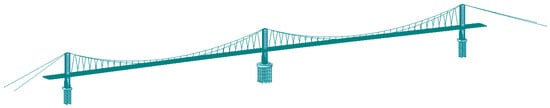 During the modeling process, only the main girder of the suspension bridge segment was considered. A complete numerical model was constructed in MIDAS according to the actual arrangement of the main cables and hangers. The boundary conditions were defined with full consideration of the bearing configuration at the junction between the main bridge and the approach spans, as well as the contact boundary conditions between the main girder and the central and side towers. At the central tower, transverse wind-resistant bearings and longitudinal restraining bearings were applied, whereas at the side towers, transverse wind-resistant bearings were installed. In the transition regions, vertical bearings together with transverse wind-resistant bearings were provided. A schematic of the established suspension bridge model is shown in Figure 2.