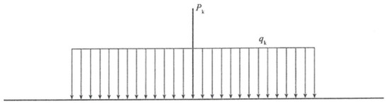 According to the General Code for Design of Highway Bridges and Culverts [26], the load types considered in the analysis of the main bridge primarily include permanent actions, variable actions, and accidental actions. In this study, the self-weight of the main girder and the weight of the deck pavement are taken as permanent loads, where the unit weight of steel is taken as 78.5 kN/m3 and that of the pavement is taken as 24 kN/m3. For variable actions, the standard Highway Class I vehicle load specified in the code is adopted as the lane load, with the uniformly distributed load qk set to 10.5 kN/m and the concentrated load Pk taken as 360 kN according to the bridge span (see Figure 3). In addition, wind loads and temperature effects of the main girder are also considered as part of the variable actions, while accidental actions are not included at this stage. Based on the combined effect of permanent and variable loads, a stress and displacement–deformation analysis model of the suspension bridge under different loading conditions is established.