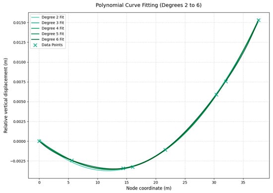 Using these data pairs—girder node coordinates X (in m) and corresponding vertical deformation Y (in m)—a set of characteristic points (Xi, Yi) is obtained from the global finite element results. A least-squares polynomial fitting is then performed: