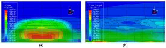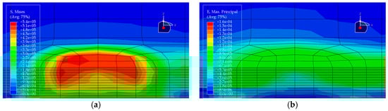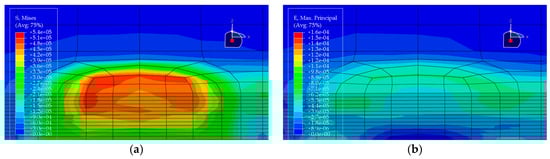 Under the standard axle load condition, the same load is applied to each of the five pavement structures, and the corresponding stress and strain distributions are obtained (see Figure 10, Figure 11, Figure 12, Figure 13 and Figure 14). In each figure, (a) shows the stress contour plot and (b) shows the strain contour plot, both extracted at the loading section to visually illustrate the distribution patterns. The maximum vertical tensile stress, longitudinal tensile strain at bottom of pavement layer, and interlayer shear stress responses of the bridge deck pavement under the standard axle load are summarized in Table 5.
