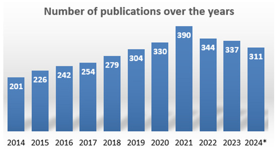 Evolution of the literature over the years (2014–2024). The * sign corresponds to the incomplete analysis for year 2024 as the study was conducted in October.