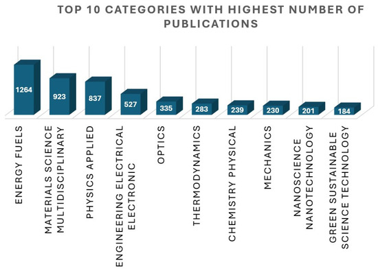 Figure 3 is a visual representation of the fact that the topic is not limited to one category. It crosses many disciplines of knowledge and plays a significant part in each field of science. The top ten categories with the highest number of citations from the “web of science” are presented. The bar indicates the number of publications associated with the category mentioned on the X-axis. It crosses many disciplines of energy, physics, and nanotechnology. The top three categories include energy, material science, and applied physics, as depicted in the diagram.