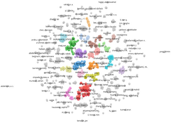 The deep analysis of Figure 4 and Figure 5 confirms the collaborative pattern between authors. The authors seem to work in small groups and collaborate with other research groups. Many clusters are interconnected to more than one cluster, showing interdisciplinary collaborations between researchers. Every group has one highlighted author with the greatest number of published papers, showing its major influence in numerical modeling for solar cells. The most prominent authors in this analysis are Baig Faisal and Ramasamy, P., who have the highest number of documents (twenty-one papers) published in this field. The isolated authors represented working independently and in small groups without many collaborations, who could be involved in joint research through projects, conferences, and joint publications to strengthen the research in this area.