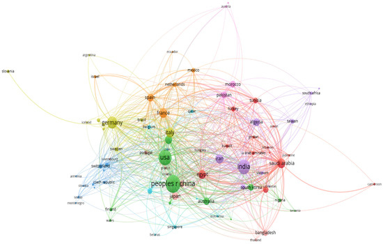 Co-authorship analysis was repeated to create the geographical distribution by considering the affiliation of authors to different countries. After creating a thesaurus of data by removing the country that appears twice because of different spellings, a total of eighty-two countries were identified. Each item is a country and is linked to others if they have published something together. The following criteria were the same as the co-authorship analysis when considering those who have published at least three studies. A total of ten clusters with 743 links and 2235 link strengths were identified, and each was represented in a different color to show the countries that have published together. Figure 6 shows the largest set of countries that are connected to each other and publish at least three studies. The countries with the highest number of link strengths are the Republic of China and the United States in cluster two, represented in green color. It would be fruitful to collaborate with the countries that are not in the network to strengthen the scientific community related to the numerical methods in the field of solar cells.