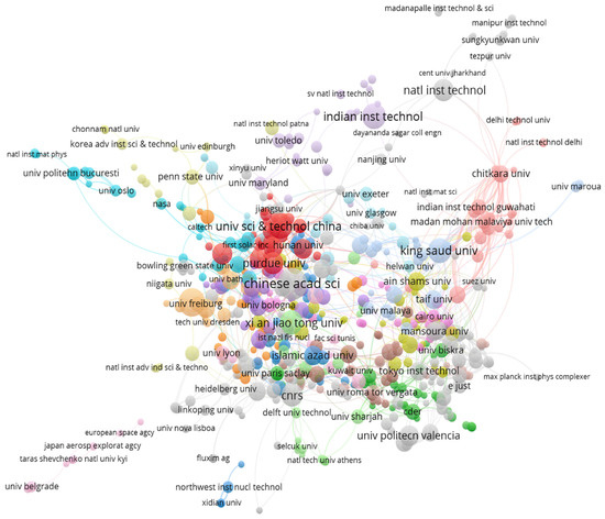 All studies were included to find the organizational relation for the numerical modeling of solar cells by VOS viewer software. A total of 700 organizations were identified in complete data, but after creating a thesaurus by replacing initials with full names and names of the institutions in local languages with English, the number reduced to 674. The threshold was to have at least three publications, as per previous analysis performed for co-authorship and geographic affiliations. Figure 7 shows the largest set of connected organizations having at least three studies in this field, with forty-one clusters appearing with 2014 links and 2962 link strengths. The Chinese Academy of Sciences (CAS) was found to have a maximum link strength of seventy-nine, enclosed in cluster twenty-three with fifty-eight scientific documents published. This also correlates with the fact that China is a dominant country in the geographical analysis and justifies the maximum link strength of CAS. The analysis can give insights into the groups and organizations working together on this topic. Further development of the topic can be performed by maintaining the current collaborations and involving the organizations that are currently working in isolation.