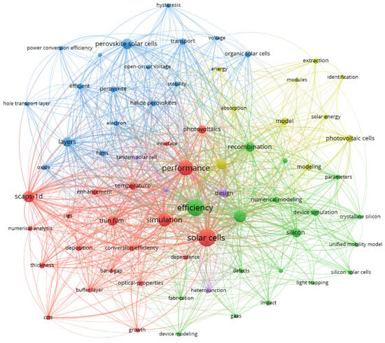 The twenty most important keywords that occurred in the dataset are presented in Table 2. Efficiency is the keyword with the highest occurrence and link strength. It is also one of the most important parameters when considering the performance of solar cells [23]. The rest of the 19 keywords are also closely related to efficiency, as there are multiple factors that can contribute to the efficiency of solar cells. An important thing to highlight here is the occurrence and link strength of the words that are closely related to the numerical modeling. Many words like simulation, numerical simulation, device simulation, design, scaps-1d are related to the numerical modeling of solar cells but appear multiple times here because of the separate ways of representation in studies. The number of times that a keyword occurs and its link strength represent its usefulness in this field. Keywords related to the simulation have a high occurrence and link strength of 153 and 358, respectively.