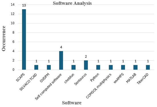 A software analysis has been performed to understand the different software used for the numerical modeling of solar cells. Complete datasets, including all 28 papers, have been used to obtain this analysis to figure out the most used software for the computation of solar cells. Figure 9 shows eight different software and self-computed techniques that have been widely adopted among researchers for the analysis. The most used software is SCAPS-1D, with the highest occurrence of being used in 13 studies [14,24,28,32,34,35,36,37,38,40,41,43,44]. The self-computation technique is being adapted in four studies [42,47,49,50]. COMSOL Multiphysics software Version 6.4 can be a good candidate to be used for self-computed code. The rest of the software is used twice [33] or once in each publication.