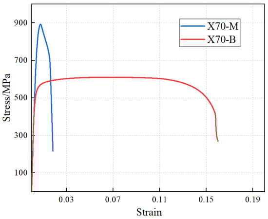 The markedly different tensile responses of X70-M and X70-B originate from the gouge-induced altered layer. Severe plastic deformation during gouging causes significant work hardening, which elevates the yield and ultimate strengths. Meanwhile, the altered layer contains a high density of defect, which accelerates damage accumulation and suppresses uniform plastic deformation, leading to the observed “high-strength–low-ductility” behavior.