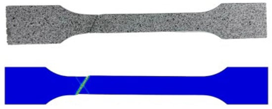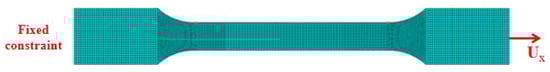To avoid excessive errors caused by mutual dependence among multiple GTN parameters, six of them are specified with reference to the studies of Acharyya et al. [18,19,20,21,22,23], namely, q1 = 1.5, q2 = 0.88, q3 = 2.25, εN = 0.1, SN = 0.3, fN = 0.0008. The remaining parameters f0, fF and fc are identified by finite-element inverse calibration. For this purpose, a uniaxial tensile finite element model, whose dimensions are consistent with those of the tensile specimen, is established as shown in Figure 6, and is used to back-calculate the parameters against the experimental results.