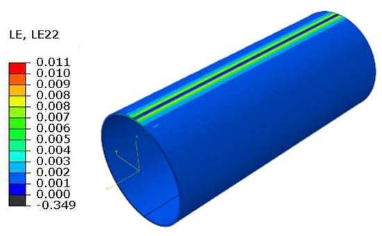 Representative nodes were selected on the surface of the base material, away from scratches and edge constraints (at axial distances greater than 3 L from the center of the scratch and circumferentially avoiding the meridian line where the scratch is located). The circumferential logarithmic strain LE22 was extracted in a custom cylindrical coordinate system and compared with the theoretically calculated circumferential strain. The simulation result was 2.588 × 10−3, as shown in Figure 10. Its strain response closely matches the theoretical value, with a deviation within 5%, indicating that the model reasonably describes the stiffness and deformation characteristics of the base material region. This provides a reliable benchmark for subsequent modeling of local degraded layers and crack initiation simulations. This validation result further supports the accuracy of the load, boundary condition, and material parameter settings in the model.