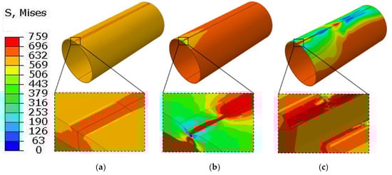 Von Mises stress distribution (MPa) of the gouged pipeline considering the metamorphic layers under internal pressure. (a) Before crack initiation; (b) Crack initiation; (c) Radial penetration.