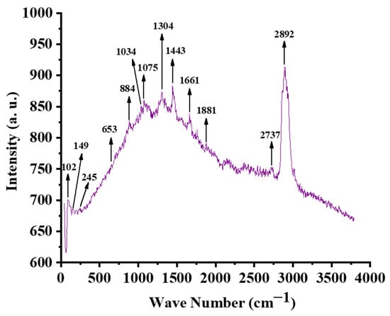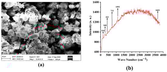 The Raman spectrum of the sample shows peaks at 154 cm−1, 268 cm−1, 412 cm−1, 722 cm−1, 1092 cm−1, and 3653 cm−1 (Figure 1b). The low-wavenumber modes below 500 cm−1 correspond to lattice vibrations of the layered silicate framework [37], while the band at 722 cm−1 is attributed to Si–O bending vibrations [37]. A strong band at 1092 cm−1 arises from Si–O stretching within the tetrahedral sheets [37], which is a diagnostic feature of phyllosilicates. The sharp high-wavenumber band at 3653 cm−1 corresponds to structural Al–OH stretching vibration [37], confirming the presence of hydroxyl groups in the octahedral sheet. Together, these features are consistent with the Raman signature of illite, a 2:1 alumino-silicate mineral of the mica group [37].