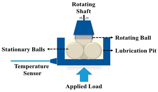 The tribological qualities of the greases were determined by their coefficient of friction (COF), anti-wear properties, and extreme-pressure properties. A four-ball tribometer (Make: Magnum Engineers, Noida, India, Model: TE-800-FBT) was used to analyze these properties [43]. Although rolling or sliding bearing tests provide application-level performance validation, standardized four-ball tribological tests are widely employed as preliminary screening tools for evaluating the friction-reducing, anti-wear, and extreme-pressure characteristics of lubricating greases (ASTM D2266 [44], ASTM D5183 [45], and ASTM D2596) [46]. The four-ball configuration offers controlled point-contact conditions with high repeatability, enabling the systematic comparison of lubricant formulations and additive concentration effects. In the present study, four-ball testing was therefore selected to establish comparative tribological trends and to elucidate the lubrication mechanisms associated with illite addition. Figure 5 shows a schematic diagram of the four-ball tribometer. The anti-wear properties of the grease samples were analyzed as per the standard of ASTM D2266, wherein the fourth ball rotated at a speed of 1200 rpm under a 40 kg load at 75 °C for 1 h. The coefficient of friction was found according to the standard of ASTM D5183, wherein the fourth ball rotated at a speed of 600 rpm under a 40 kg load at 75 °C for 1 h. All of the experiments were repeated three times and the values were averaged. Optimized samples were selected based on the results of the above tests and these were then tested on their extreme-pressure properties according to the ASTM D2596 standard. In this analysis, each test lasts for 10 s and the fourth ball rotates at a speed of 1670 rpm under a fixed load. The load was increased in subsequent tests according to the load chart of the ASTM D2596 standard until the four balls welded together or the sight of smoke from the ball pit. Test parameters were given in Table 4 [39].