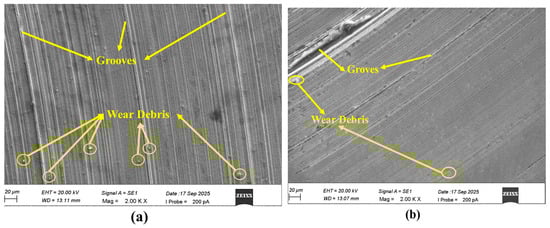 These wear tracks were found to be smaller for the grease with low concentrations of illite, and deep grooves and small micro-pitting were found on the ball surfaces with a higher concentration of illite. Additionally, wear debris was found adhered to the ball surfaces. The build-up and periodical release of this wear debris would initially increase the COF. During the surface interaction process in sliding wear, the materials either move to the wear track edges (plastic deformation) or are pushed to the wear tracks by the counter body, later resulting in wear debris [60]. As these build-up materials (wear debris) are released, the resistance decreases and hence reduces the COF. The adherence of the wear debris on the ball surfaces would also increase their roughness, leading to the formation of plastic deformations [60] and affecting the lubrication regime as seen in Section 3.3. The presence of grooves as well as adhered debris indicated a mixed wear phenomenon (abrasive–adhesive), similar to that reported by Escherova et al. [60]. Table 7 shows the changes in the surface roughness parameters (Ra and Rq) before and after the wear test. The base grease exhibits a significantly higher increase in roughness (Ra = 2.96 ± 0.41 µm and Rq = 3.56 ± 0.73 µm) compared to the greases containing illite as an additive. Among the illite-based greases, CGI2 exhibited the lowest increase in roughness (Ra = 0.73 ± 0.24 µm and Rq = 0.98 ± 0.39 µm), indicating effective tribofilm formation and enhanced surface protection against wear damage. With an increase in illite concentration, the surface roughness increased, which resulted in high surface damage.