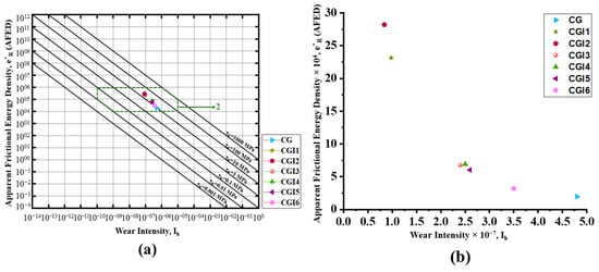 (a) Basic energy equation of wear graph for the grease samples; (b) apparent frictional energy density vs. wear intensity graph.