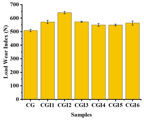- In the extreme-pressure test, while the tested samples showed equal load-carrying capacities at the last non-seizure load (LNSL) (784 N), initial seizure load (ISL) (980 N), and weld load (WL) (1568 N), their anti-wear performance was significantly different. The CGI2 composite consistently showed smaller wear scar diameters (WSD) in each load stage, demonstrating a more efficient protective film. Also, CGI2 (641 ± 8.62 N) had a 21% greater load–wear index (LWI) than CG (509 ± 9.1 N), which shows that the illite additive has better extreme-pressure (EP) performance and wear resistance. Load-carrying ability was observed to reduce with further increases in additive concentration.