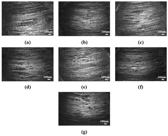 Wear scars of the balls lubricated with greases (a) CG, (b) CGI1, (c) CGI2, (d) CGI3, (e) CGI4, (f) CGI5, and (g) CGI6.