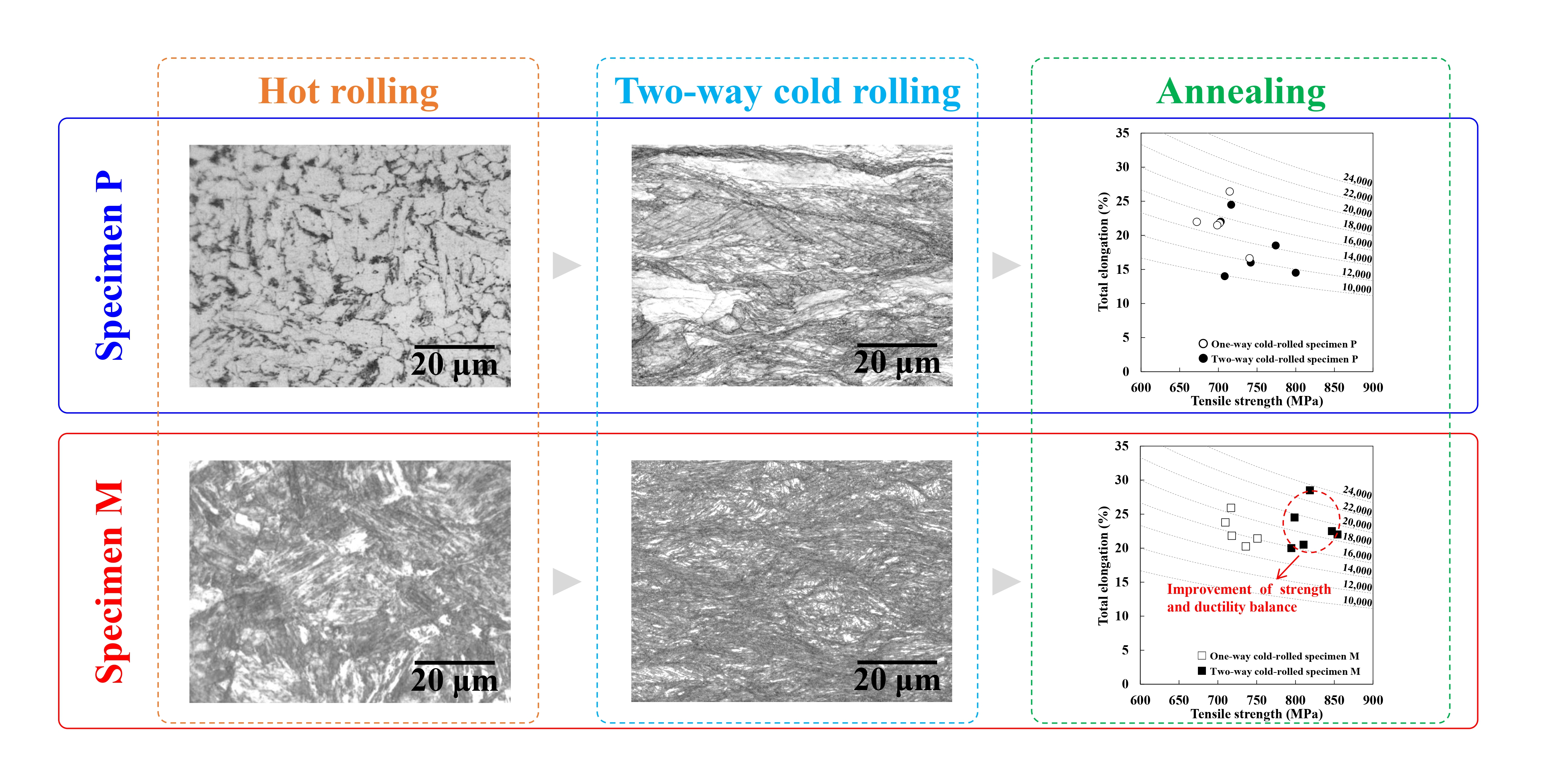 - Two-way cold rolling accelerated recrystallization during annealing in specimen P but not in specimen M. In the case of specimen P, two-way cold rolling increased the average size of recrystallized ferrite grains while reducing their aspect ratio. In contrast, it reduced the average size and the aspect ratio of recrystallized ferrite grains in specimen M.