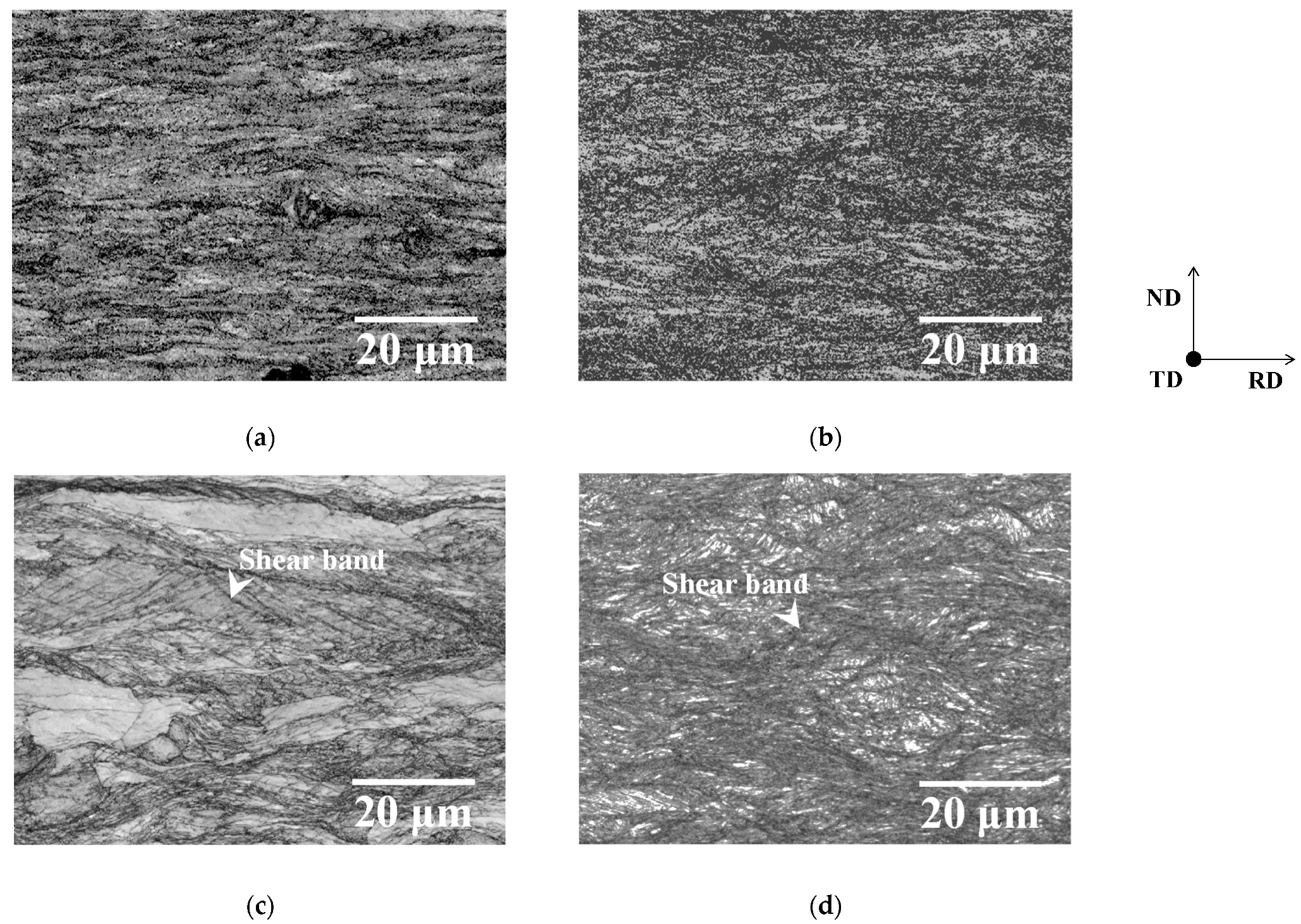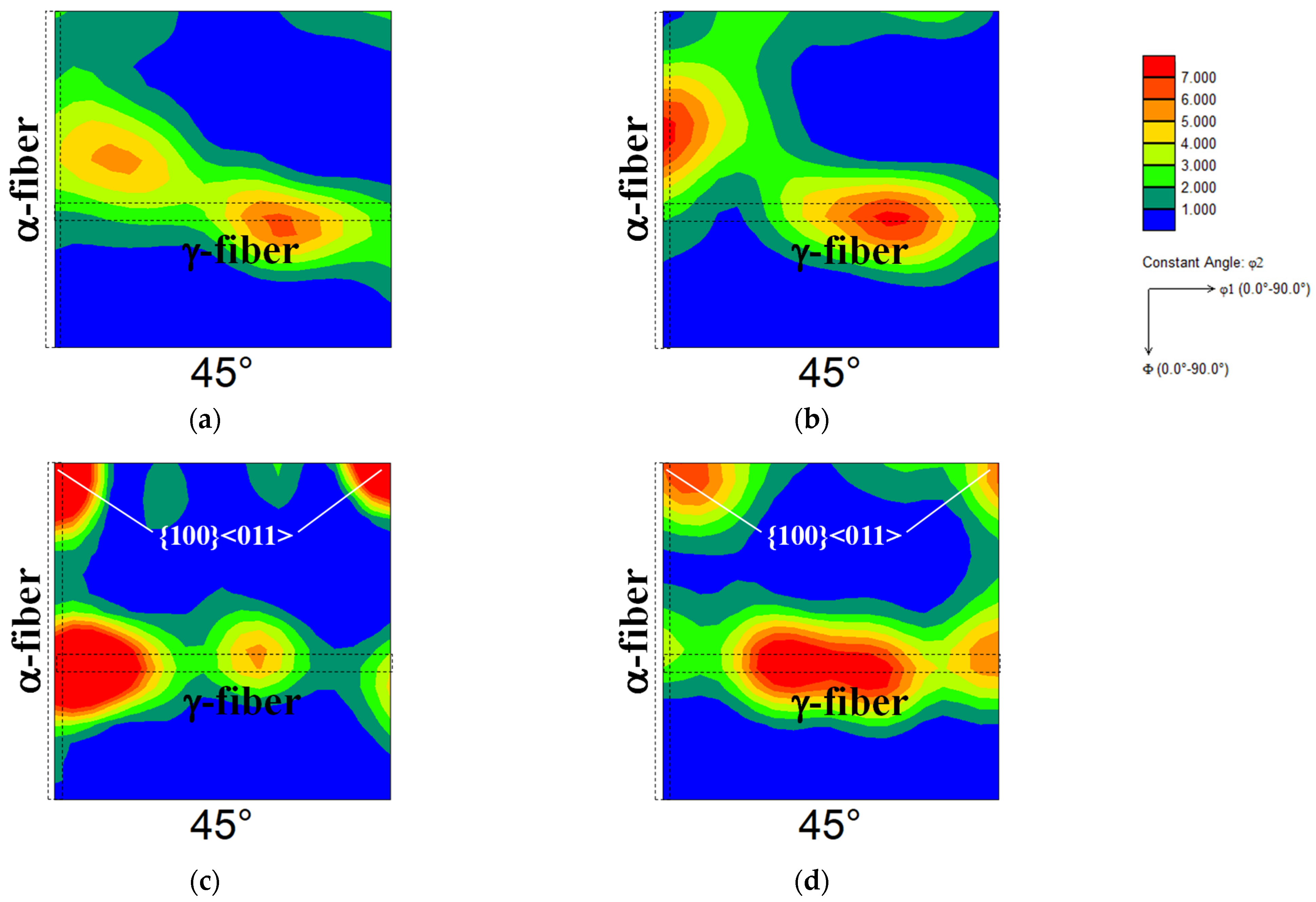 3.1. Microstructures and Textures of Two-Way Cold-Rolled Specimens