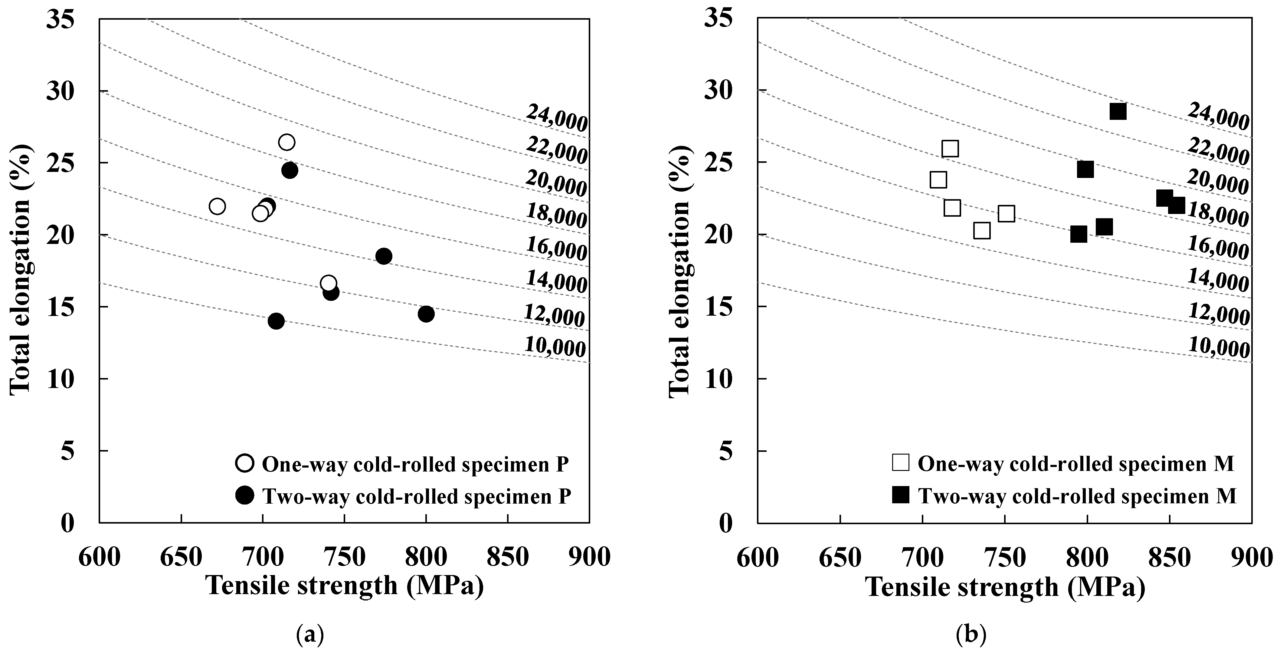 - In the case of intercritically annealed specimen P, the strength–ductility balance in the two-way cold-rolled specimen was similar to that in the one-way cold-rolled specimen. At the same time, in the case of intercritically annealed specimen M, the two-way cold-rolled specimen showed better strength–ductility balance than the one-way cold-rolled specimen.