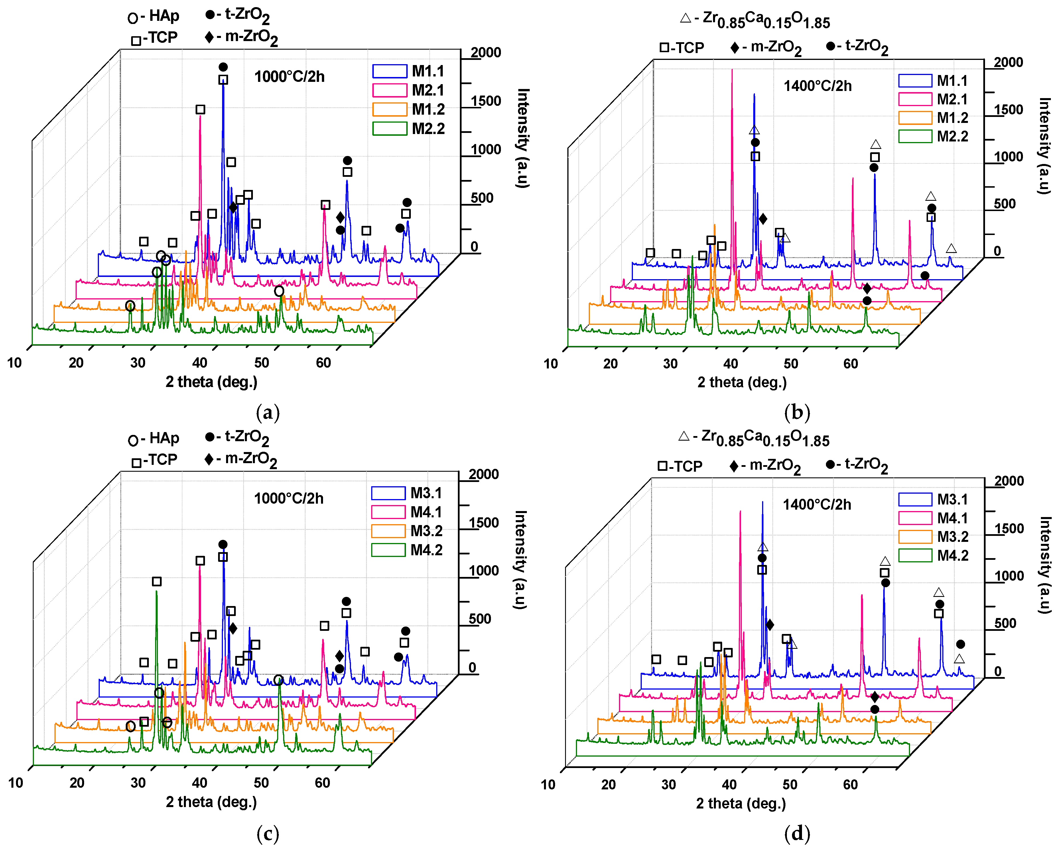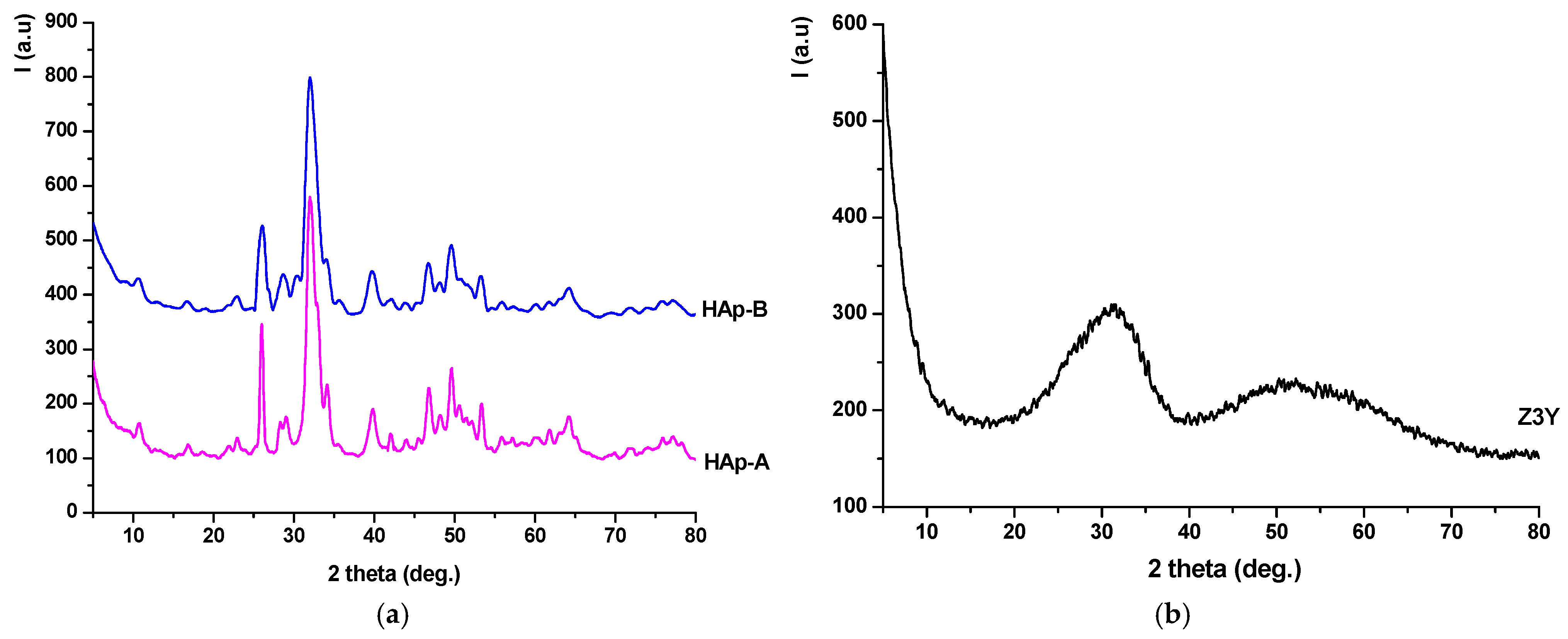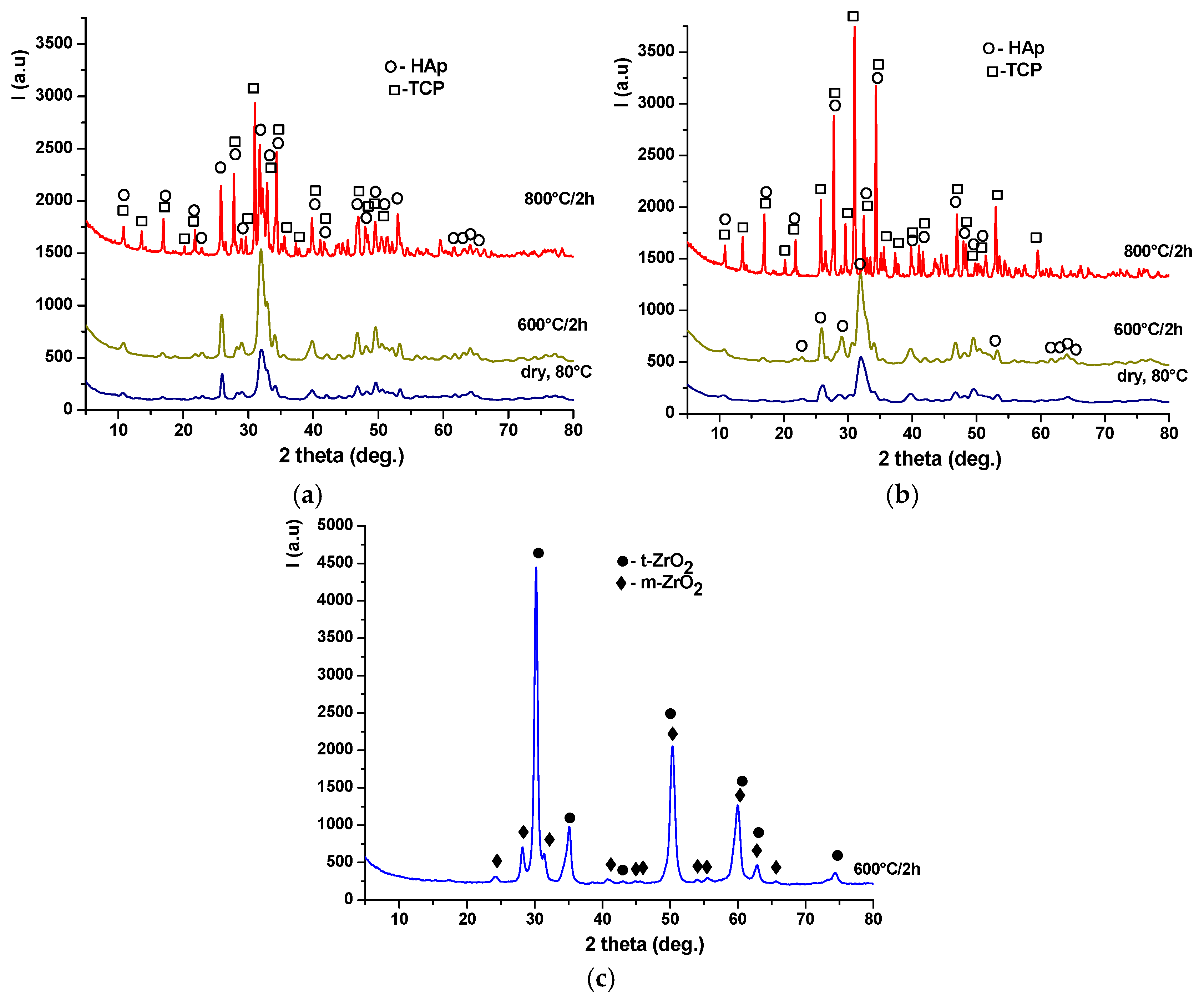 3.2. Synthesis and Characterization of HAp–ZrO2 Nanocomposite Ceramic Materials