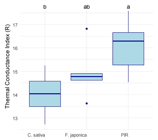 The thermal conductivity was significantly affected by the type of material (ANOVA, p = 0.046). The MBCs had a slightly lower thermal conductivity index than PIR, with average R index ± standard deviation of 0.46 ± 0.04 (R. japonica), 0.45 ± 0.02 (C. sativa), and 0.53 ± 0.05 (PIR) (Figure 1). There was no significant difference between the two MBCs, and both had a significantly lower R index than PIR (Figure 1).