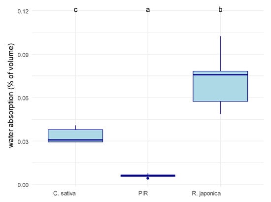 We first measured the water absorption of the substrate alone (Figure 3). The R. japonica dried leaves absorbed more water than the C. sativa shives (69%: 13.82 mL water/20 mL substrate, 56%: 11.22 mL water/20 mL substrate, respectively). The water absorption was significantly affected by the material type (ANOVA, p = 8.4 × 10−6). The MBCs made using R. japonica as the substrate absorbed significantly more water (7.2 to 2.1%) than the ones made using C. sativa (3.3 ± 0.5%), and the latter, in turn, much more than the PIR materials (0.6 ± 0.1%).