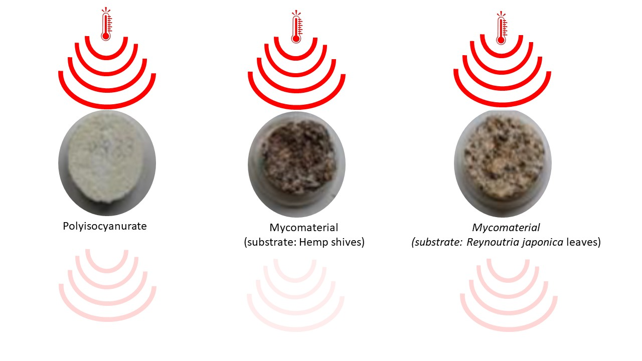 Mycelium-based composites (MBCs)—biomaterials made from fungal-inoculated substrates—are promising candidates to replace conventional rigid thermal insulation panels. However, many MBCs are made from hemp, a plant material that is quite difficult to source in many countries for regulation reasons, and mobilizes agricultural fields at the expense of food and feed crops. Meanwhile, many of our natural and urban ecosystems are subject to invasion by plants that are just burnt or even left in place, while they may be very good substrate for MBCs. This study investigated the comparative physical and thermal properties of MBCs derived from two distinct lignocellulosic feedstocks: hemp shives (a traditional material) and biomass from the highly invasive species Reynoutria japonica. Polyisocyanurate (PIR) was included as a synthetic benchmark. The MBCs produced from R. japonica demonstrated as low a thermal conductivity as the hemp MBCs in our internally developed method, but also as the PIR standard. However, they exhibited suboptimal physical characteristics: higher bulk density (166 vs. 128 kg/m3 for hemp) and significantly higher water absorption (7.5% vs. 3.5% volume uptake after 2 min). This suggest that they are a less viable alternative to hemp-based MBCs for heat insulation applications.