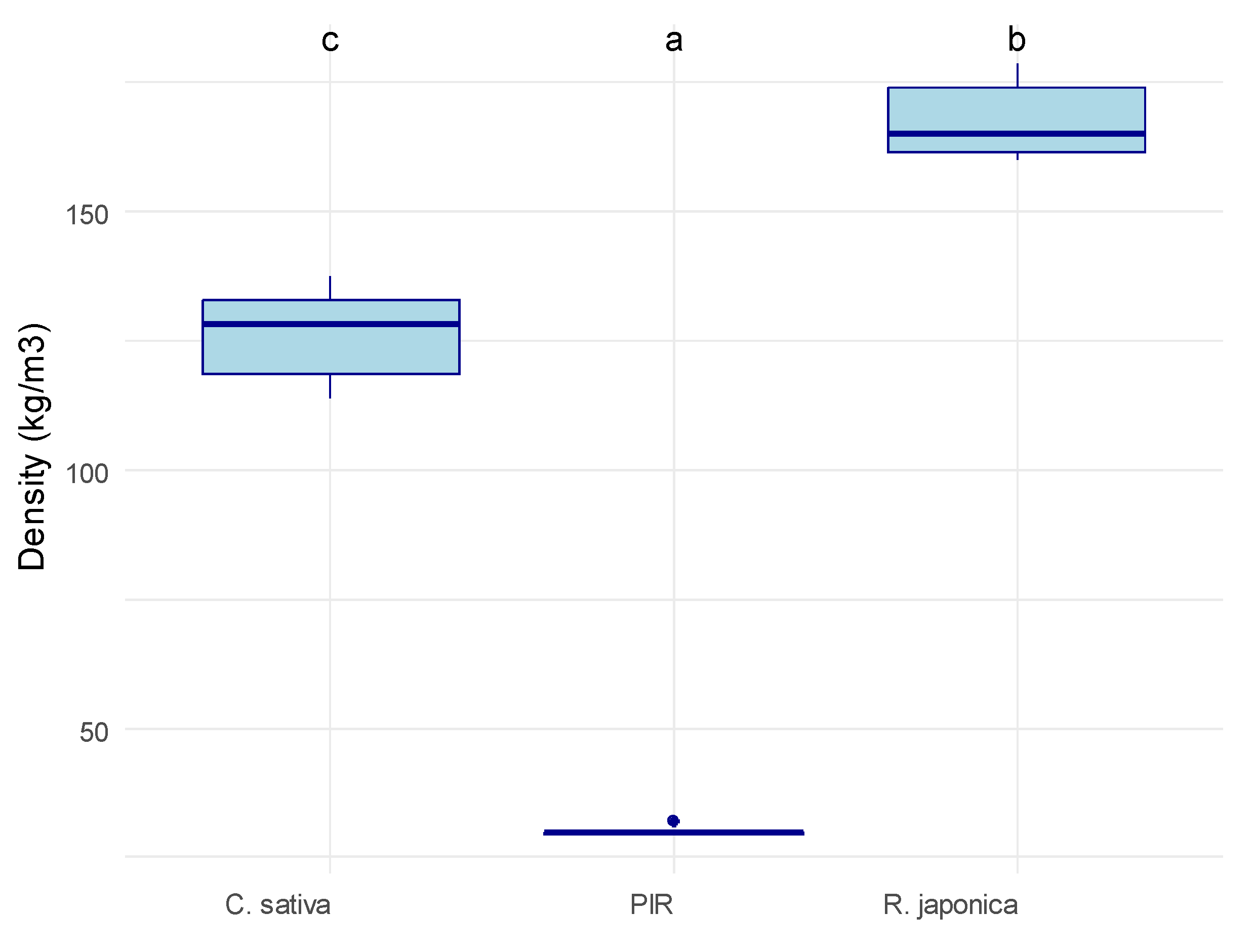 Density of the tested material samples. C. sativa = mycelium-based composite with Cannabis sativa shives as an inoculation substrate, R. japonica = mycelium-based composite with R. japonica leaf litter as an inoculation substrate, PIR = pure polyisocyanurate. The material had a significant impact on density according to a Kruskal–Wallis rank sum test (p = 0.001). Letters on top of the box plots indicate significantly separate groups based on Tukey’s post hoc test.