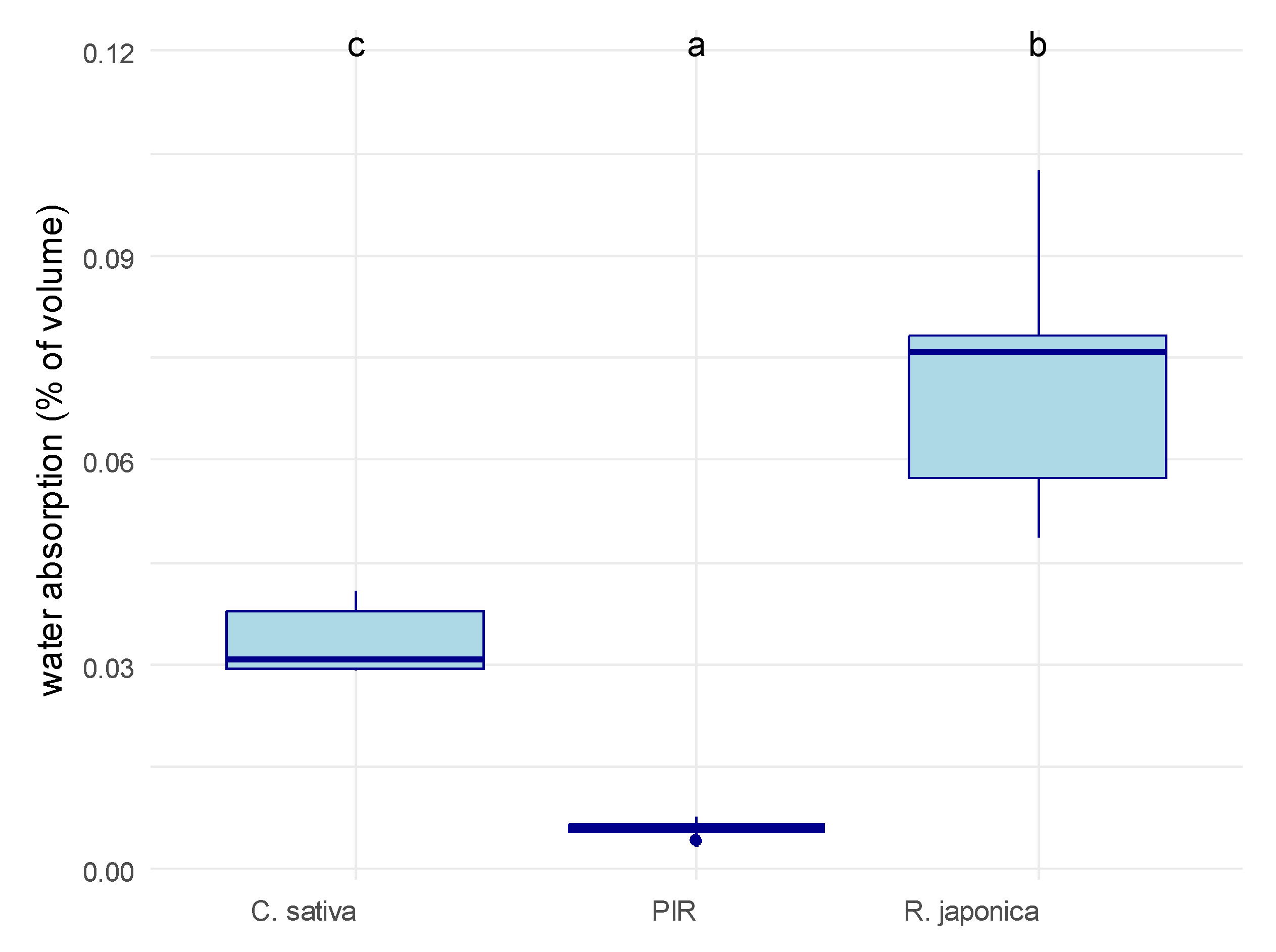 Water absorption of the tested material samples. Water absorption was calculated as %volume of material occupied by water after being submerged for 2 minutes and 30 seconds in water. C. sativa = mycelium-based composite with Cannabis sativa shives as an inoculation substrate, R. japonica = mycelium-based composite with R. japonica leaf litter as an inoculation substrate, PIR = pure polyisocyanurate. The material had a significant impact on water absorption according to an ANOVA (p = 8.4 × 10−6). Letters on top of the box plots indicate significantly separate groups based on Tukey’s post hoc test.